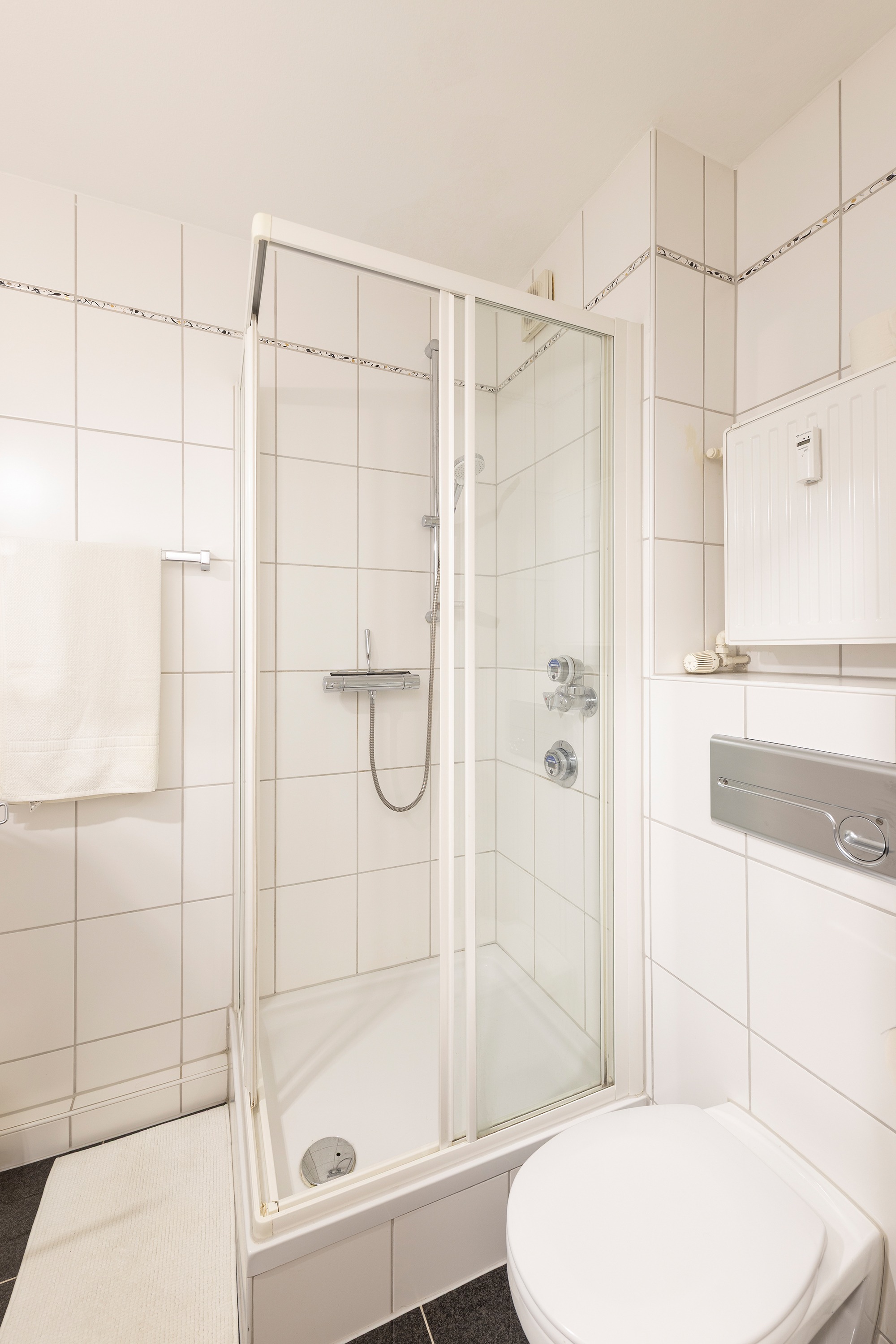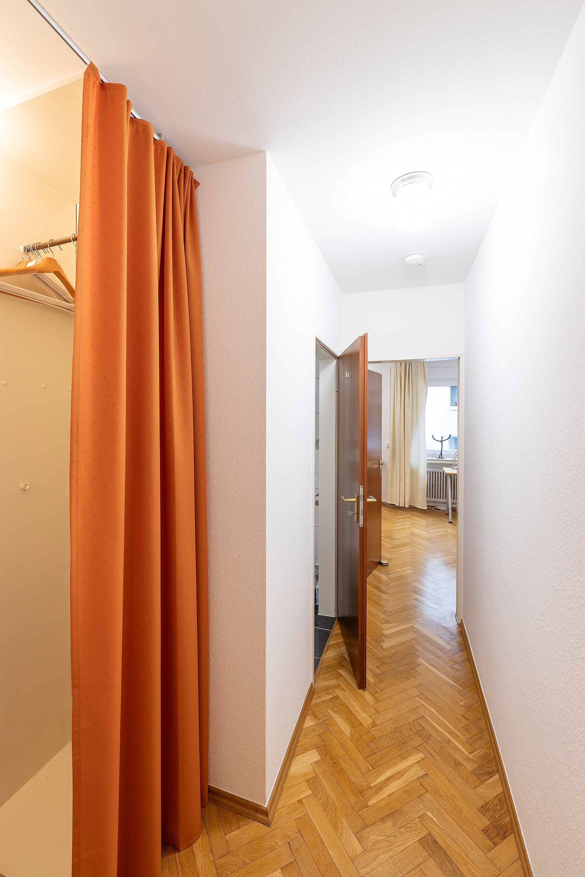 Über die Diele gelangen Sie in das innenliegende Duschbad und den Wohnraum. Die Diele hat eine kleine Nische, die perfekt als Schrank genutzt werden kann. Die große Fensterfront sorgt für viel Lichteinfall.