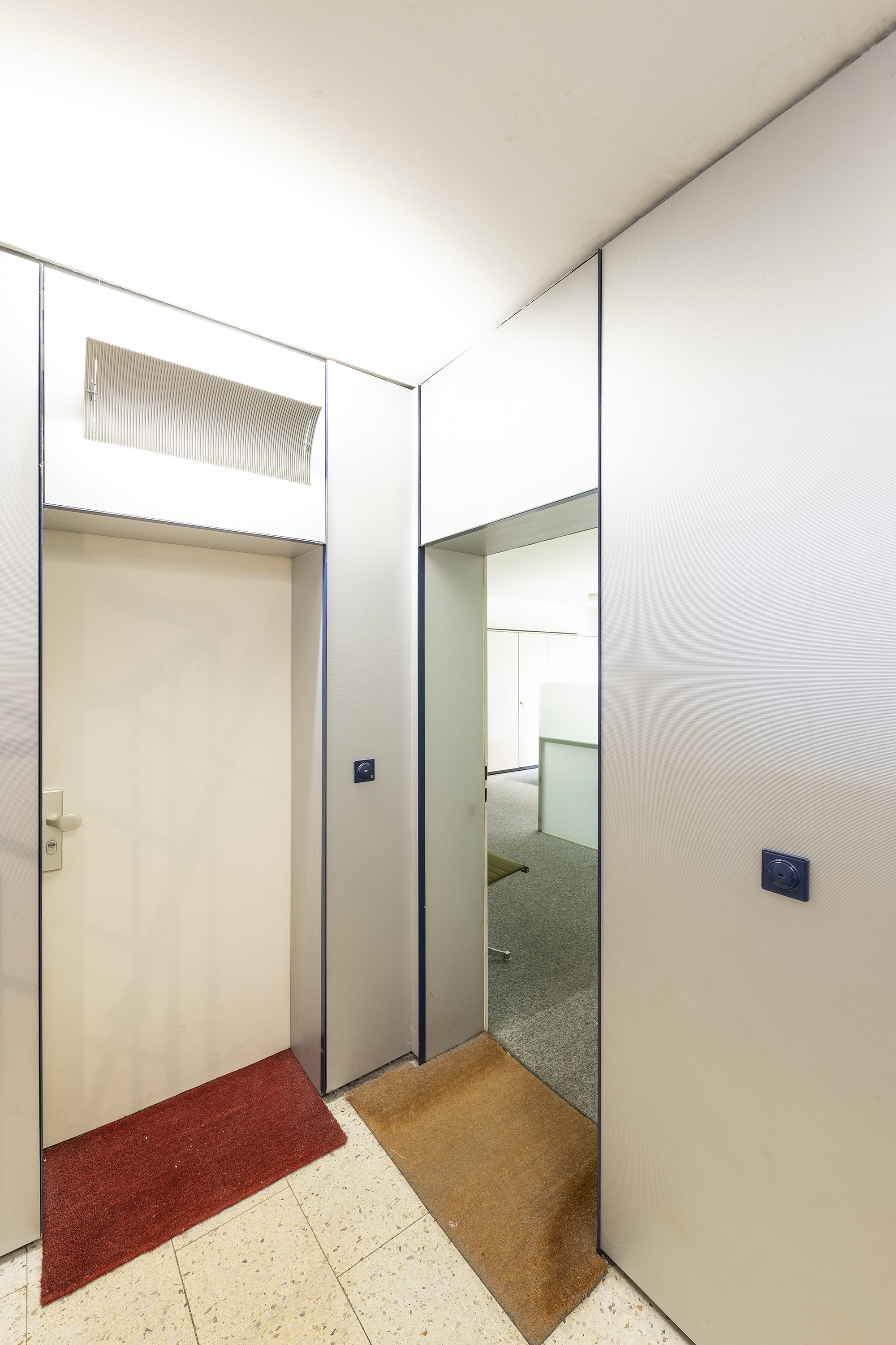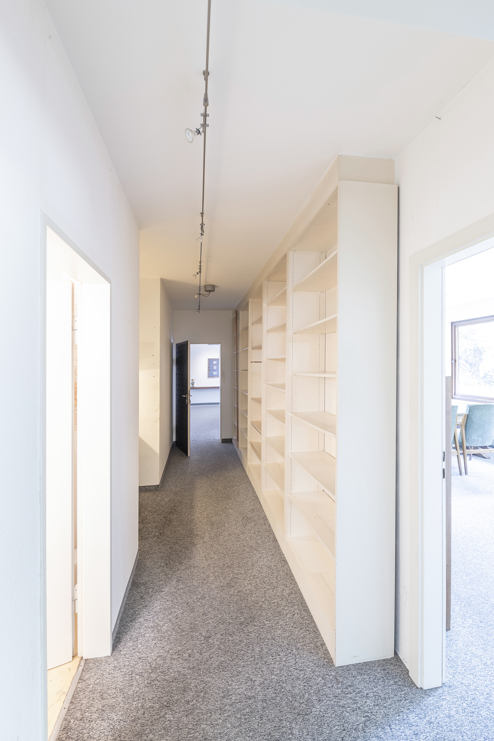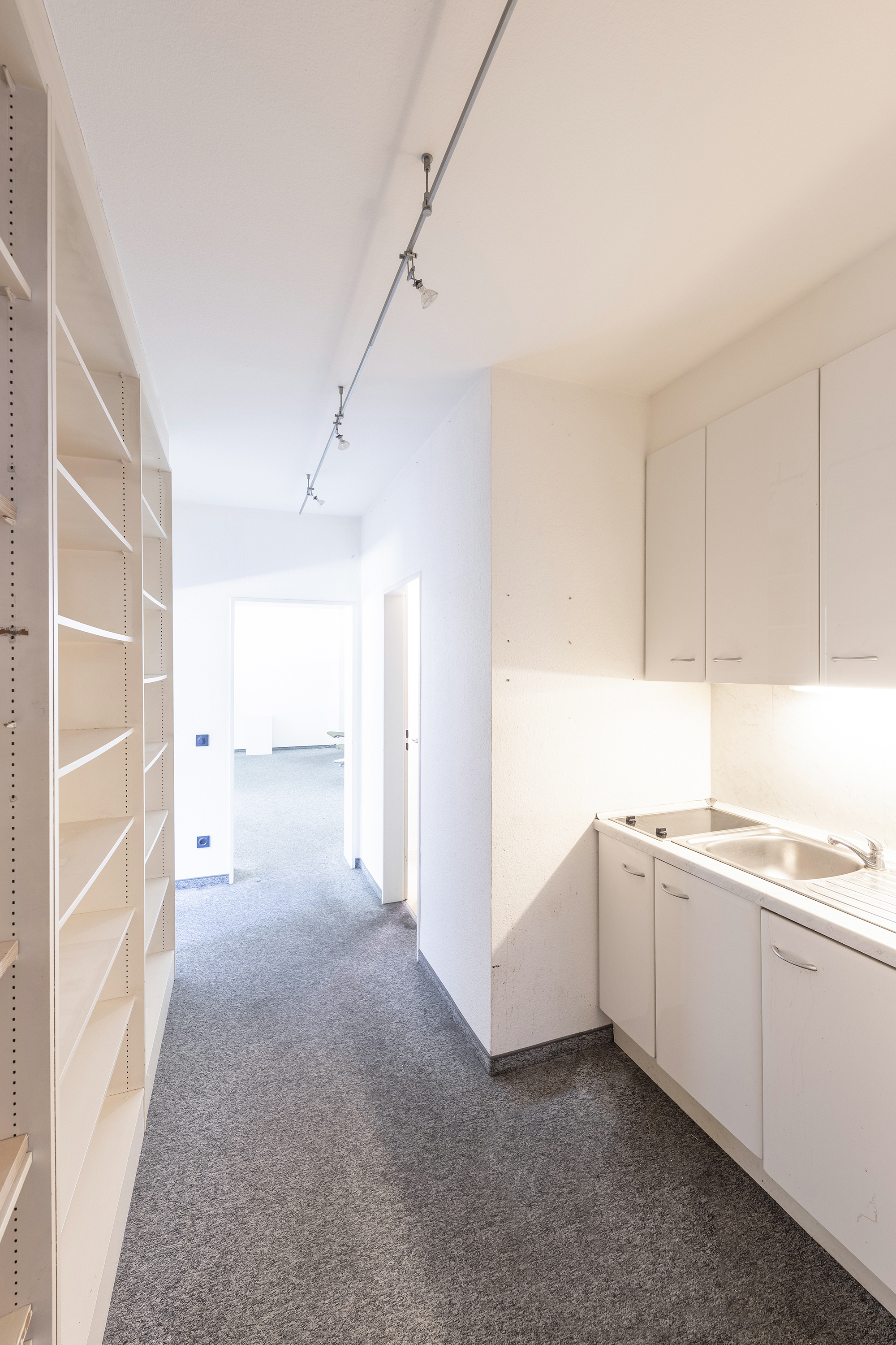 Der Empfangsbereich ist angenehm großzügig und bietet viel Bürofläche mit Platz für die Rezeption. Der abgehende Flur führt zu zwei weiteren Büroräumen und dem WC. Im Flur ist eine Pantryküche integriert.