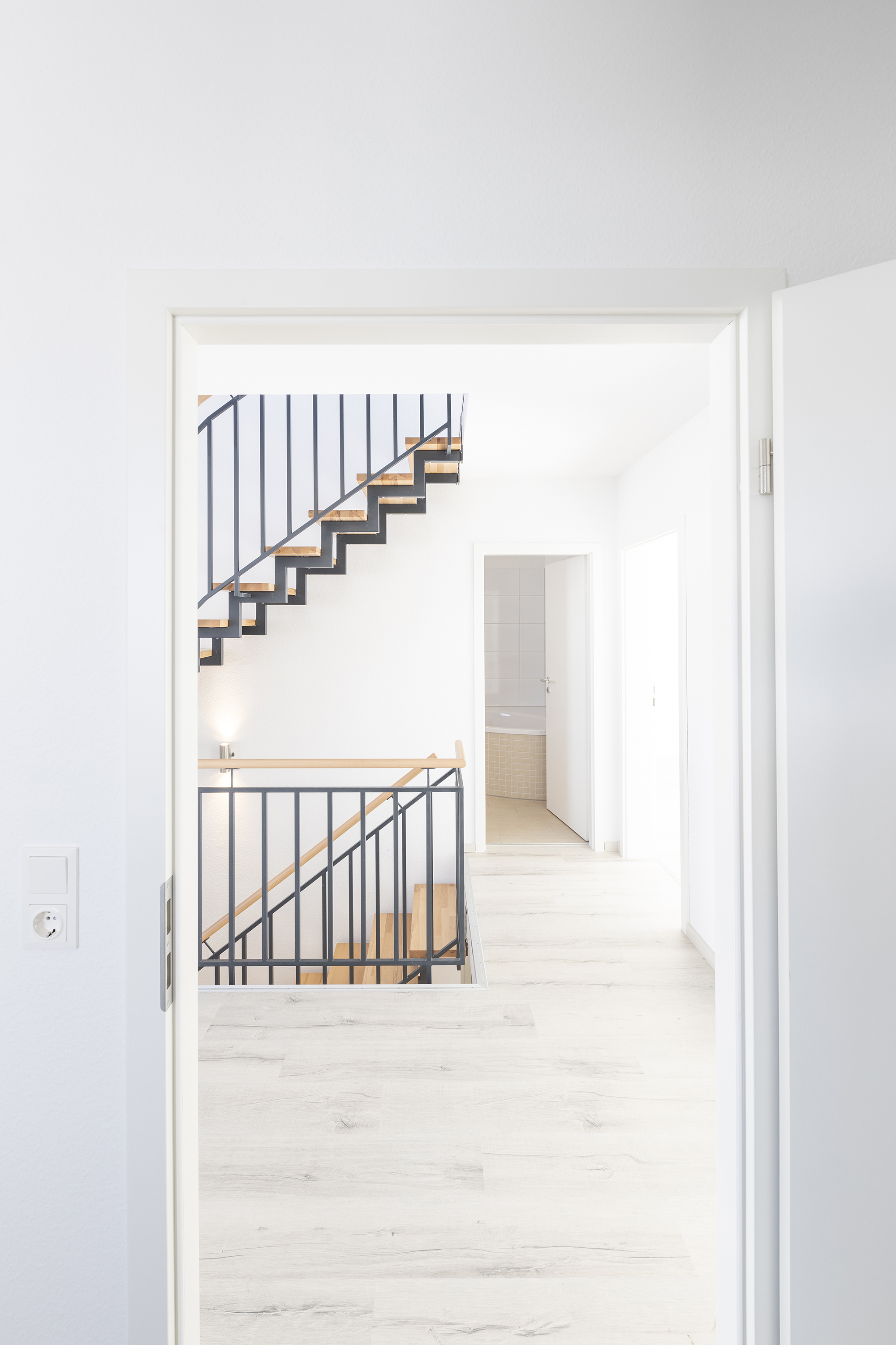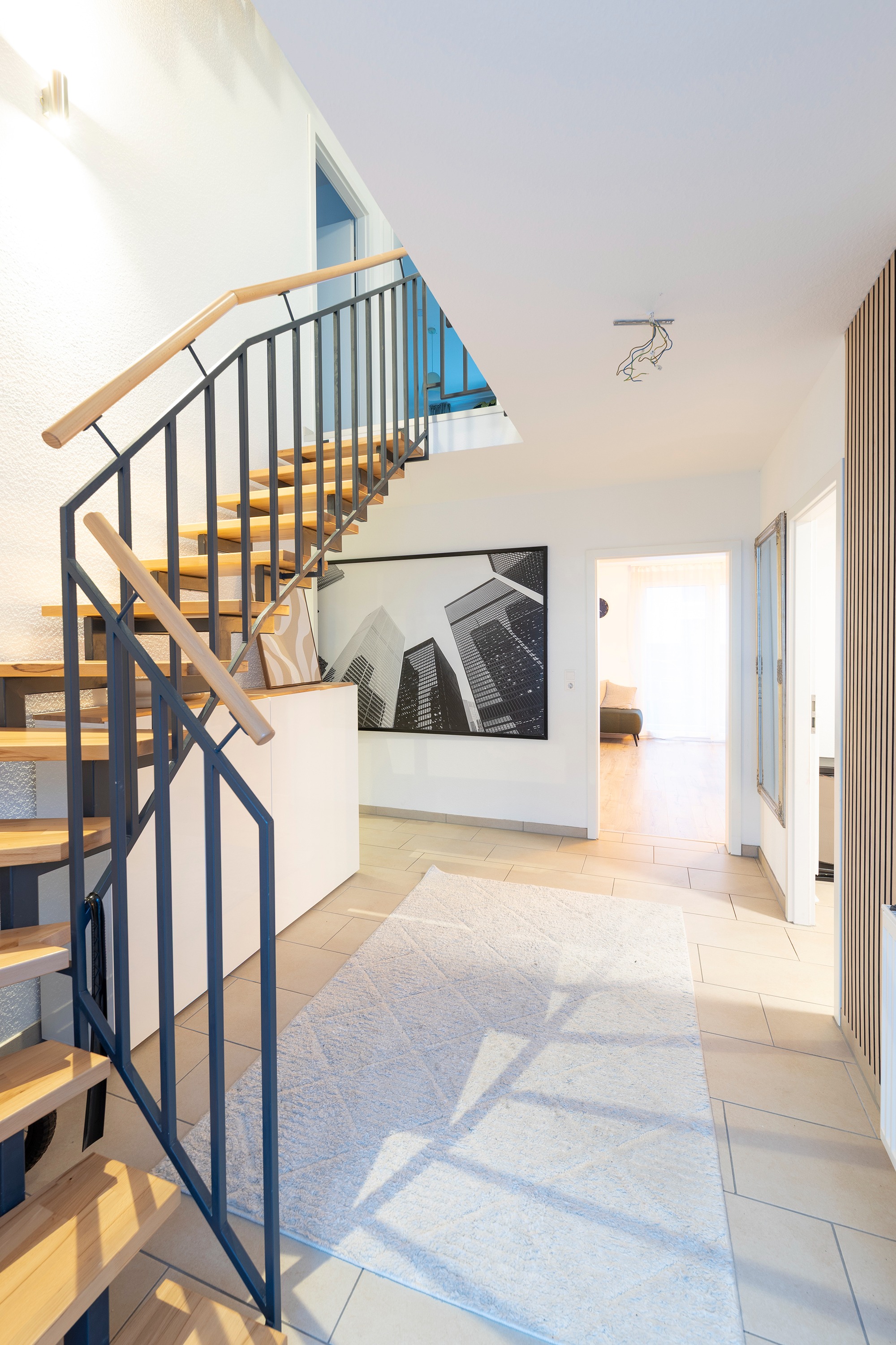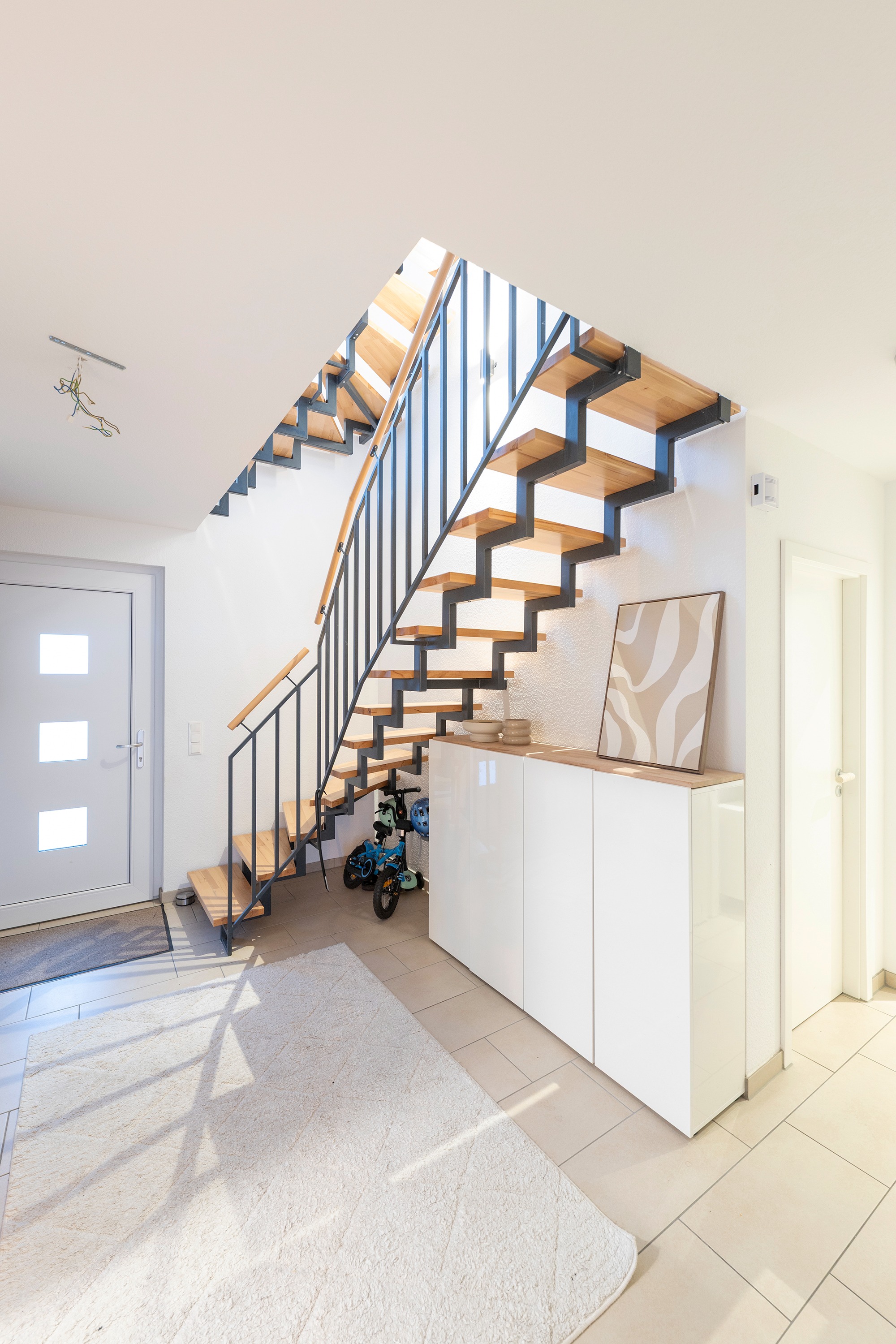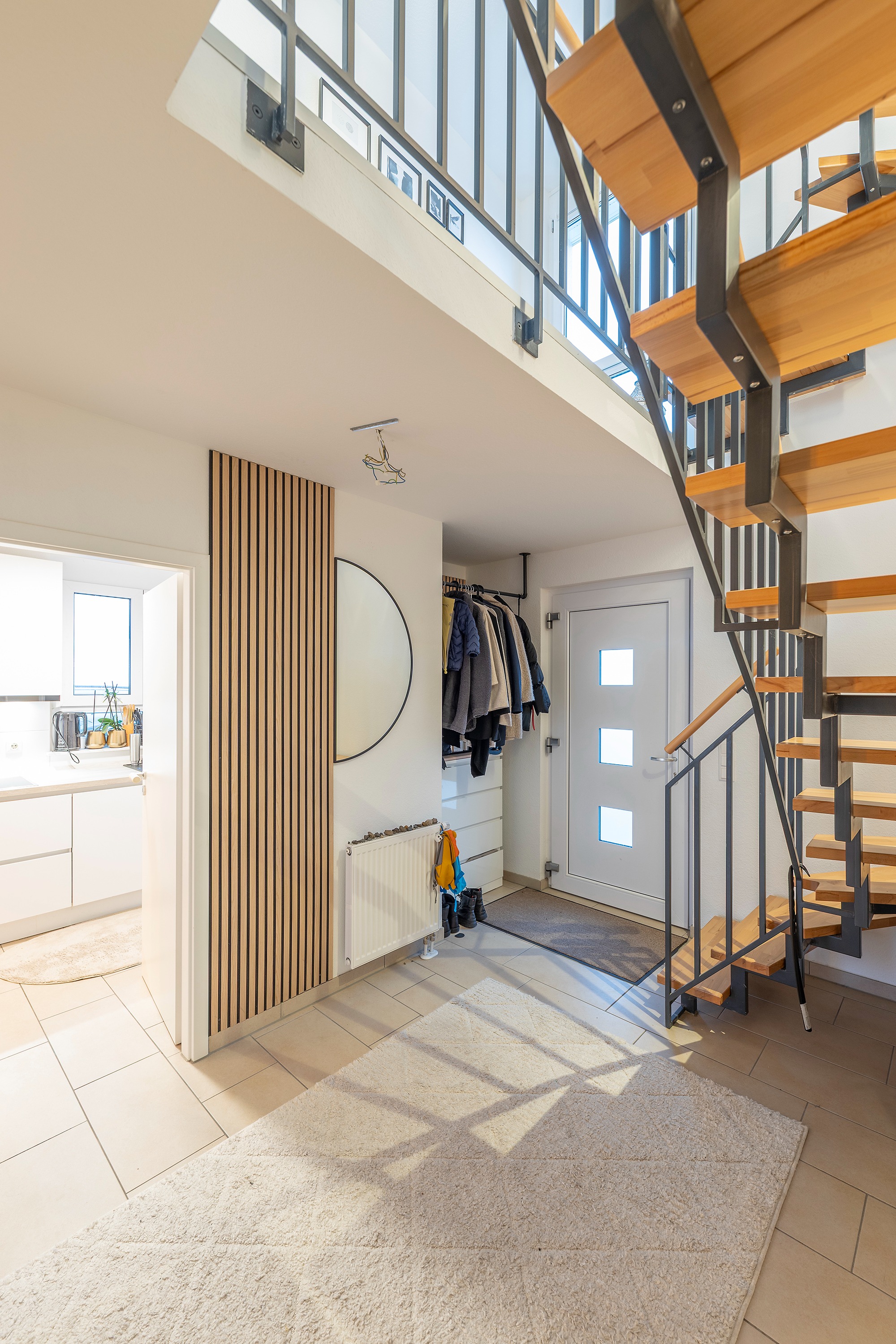 Im Erdgeschoss verbindet die Diele Treppenhaus, Gäste-WC, Hauswirtschaftsraum, Küche und Wohn-Essbereich mit Terrassen- und Gartenzugang. Die Küche verfügt zusätzlich über eine Speisekammer.
