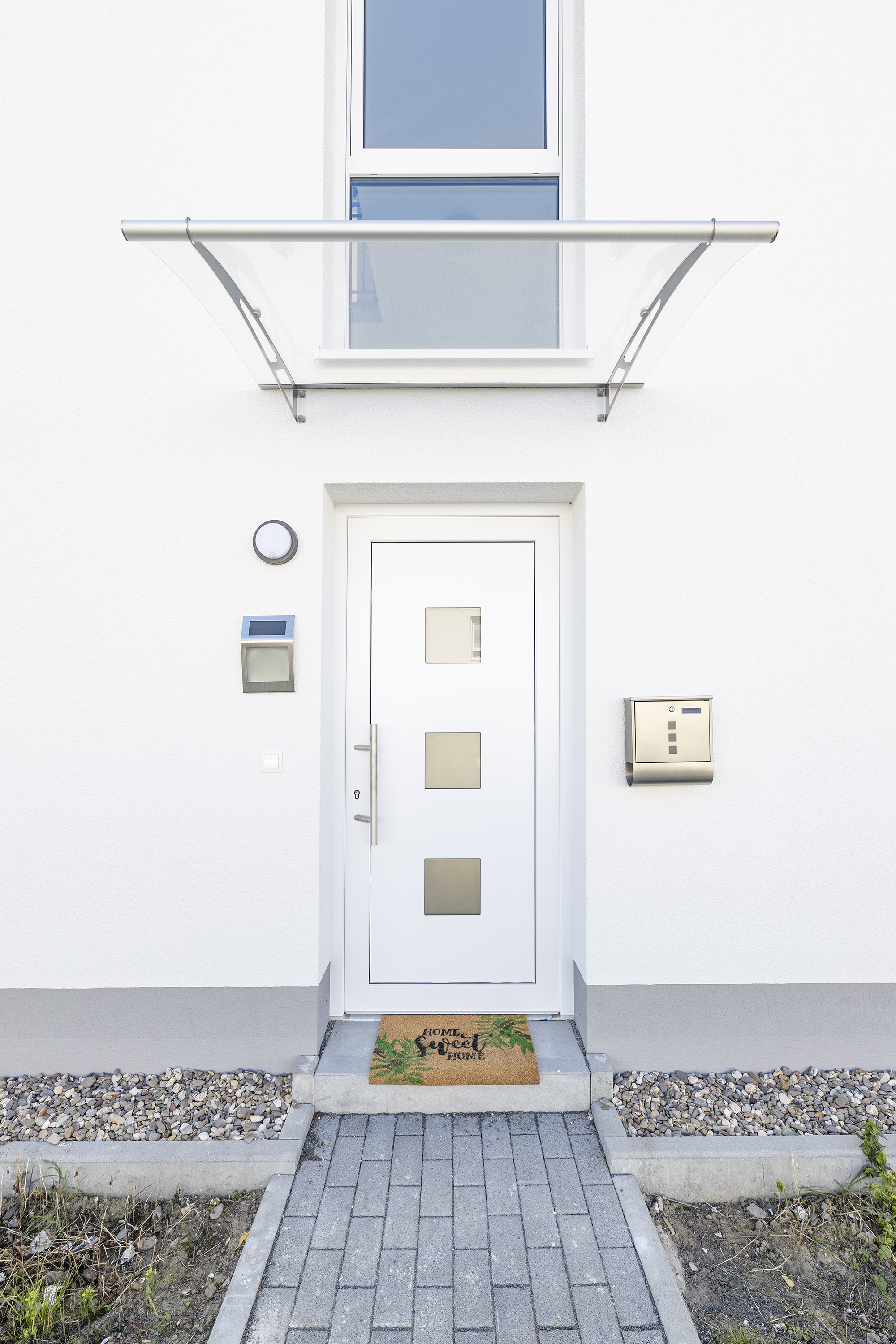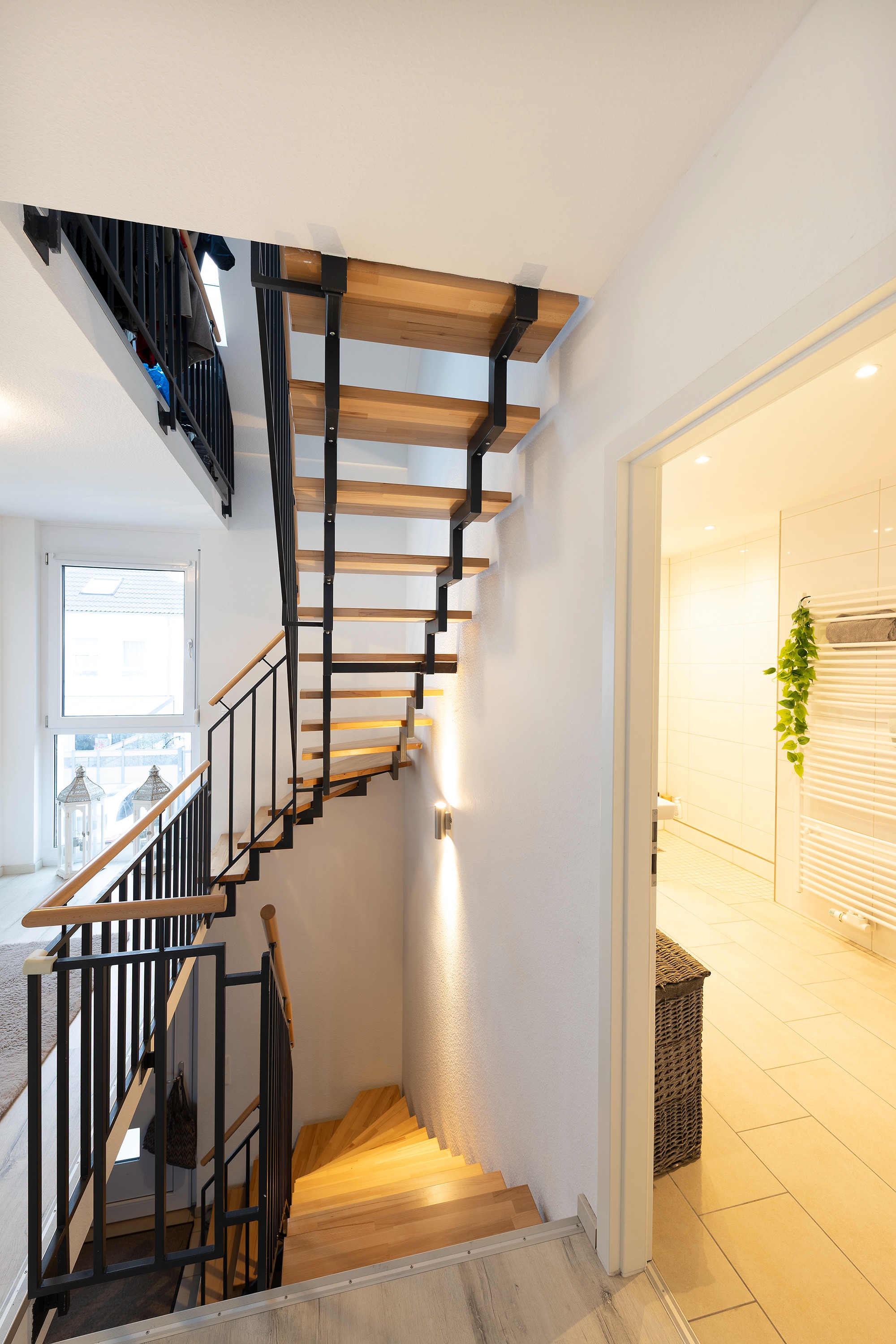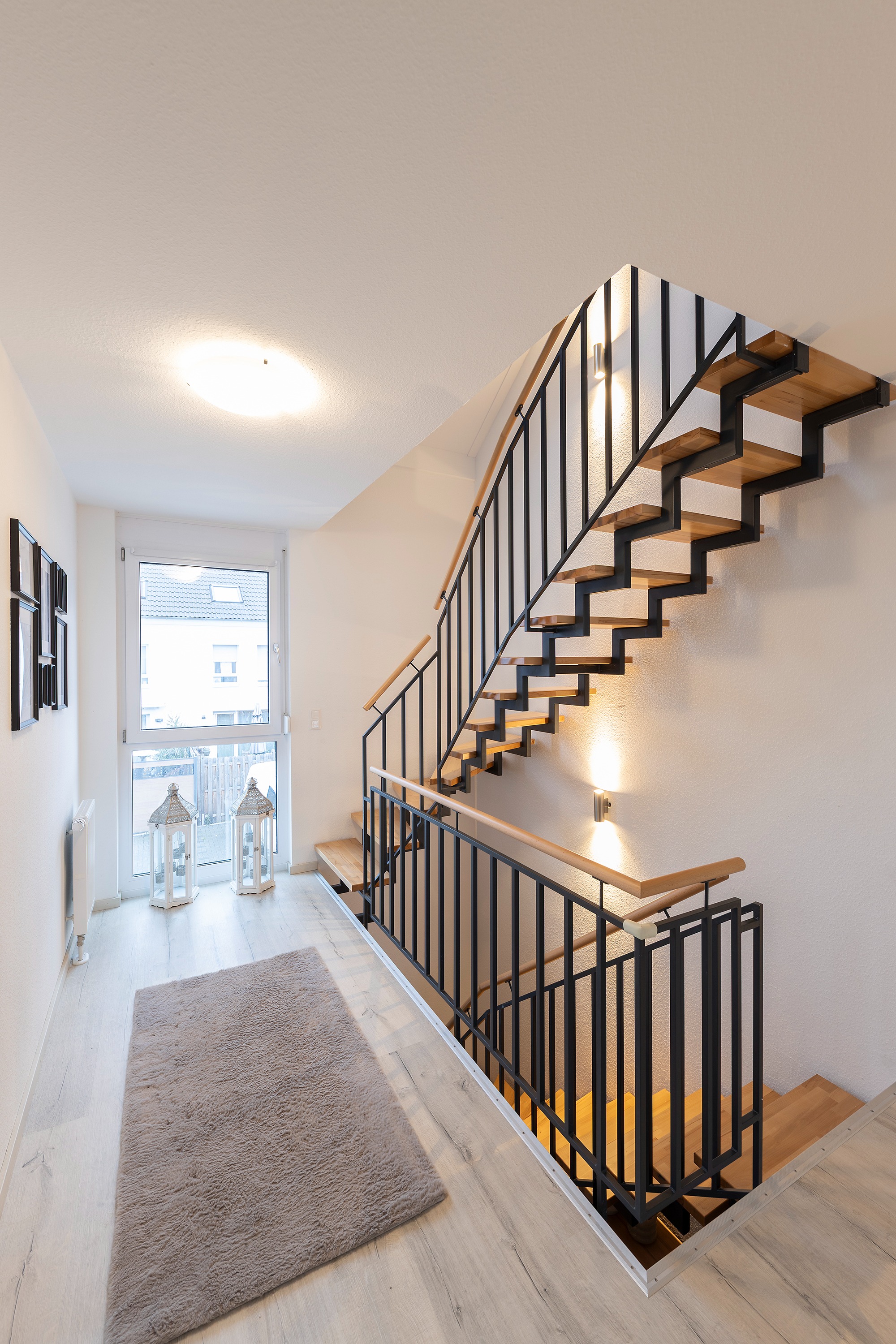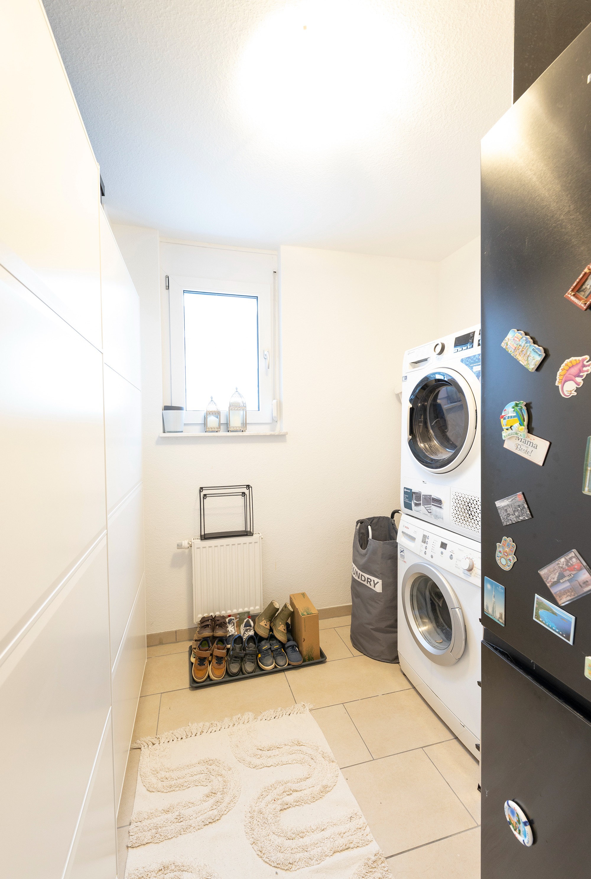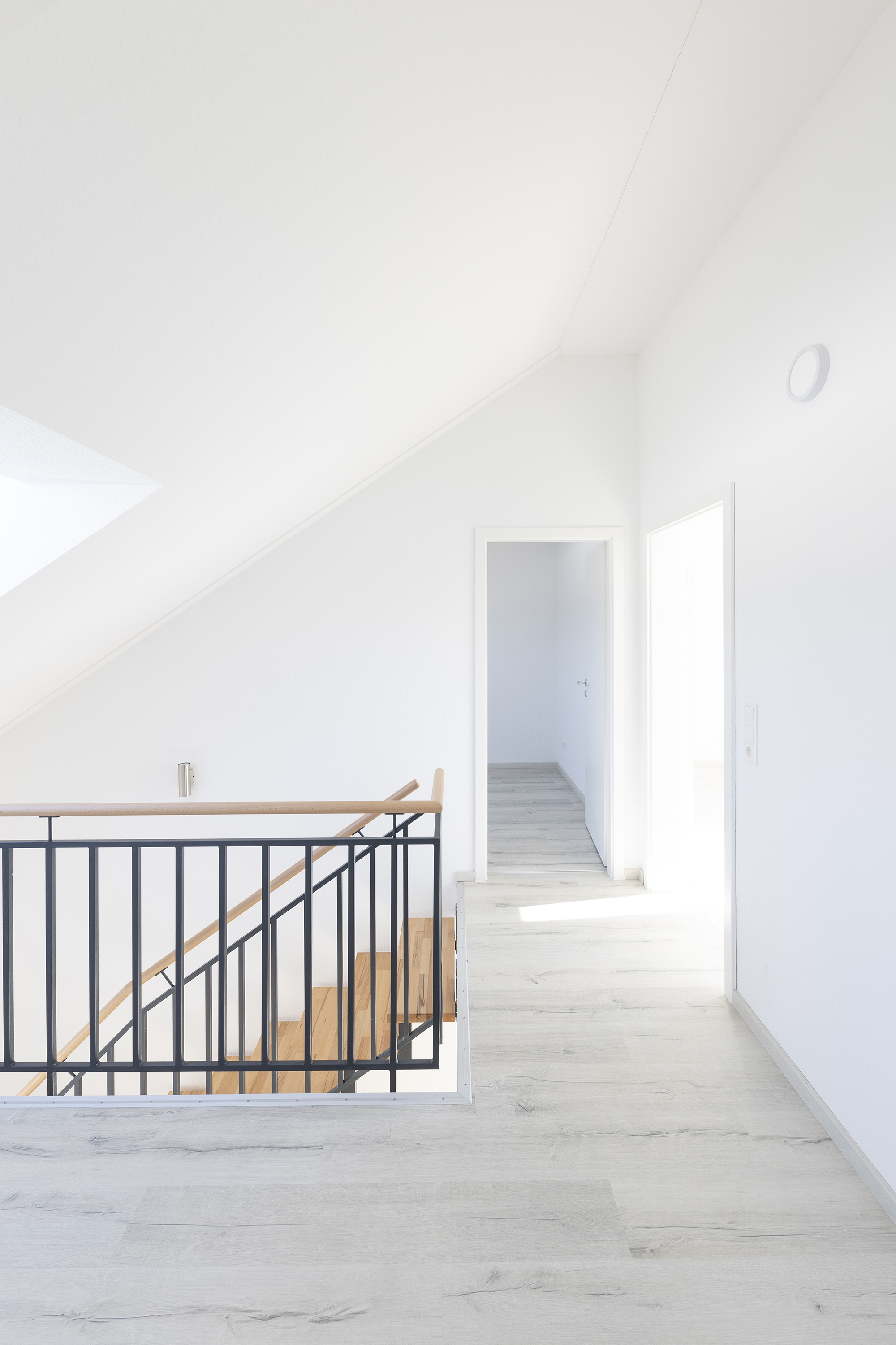 Im Erdgeschoss verbindet die Diele Treppenhaus, Gäste-WC, Hauswirtschaftsraum, Küche und Wohn-Essbereich mit Terrassen- und Gartenzugang. Die Küche verfügt zusätzlich über eine Speisekammer.