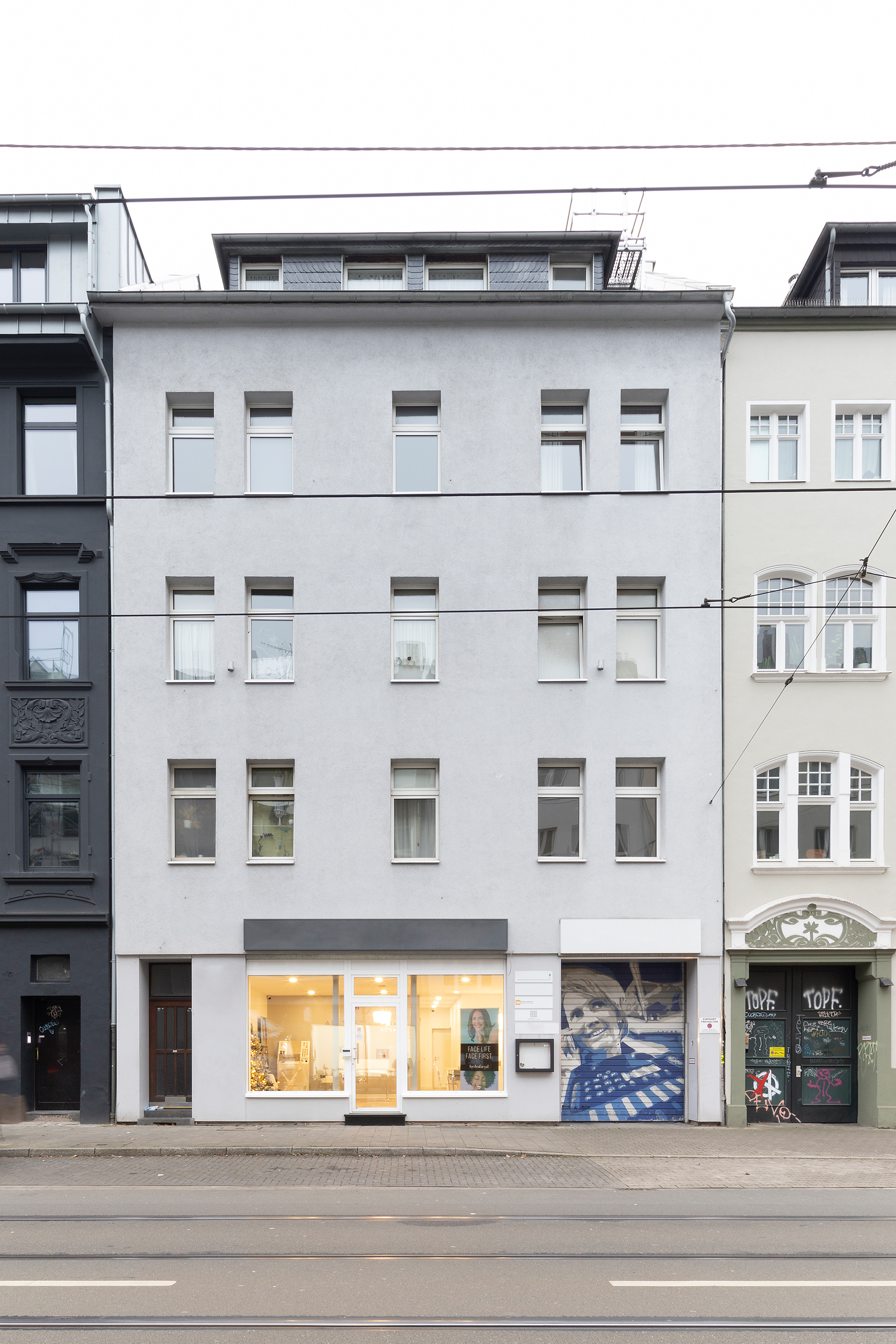 Die Wohnung liegt in der ersten Etage eines soliden Mehrfamilienhauses mit 9 Wohneinheiten, einem hochwertigen Kosmetikstudio im Erdgeschoss und einem Anbau im Hinterhof mit ruhigen Büroeinheiten. Das Ursprungsbaujahr ist von ca. 1906, der Wideraufbau von 1950.