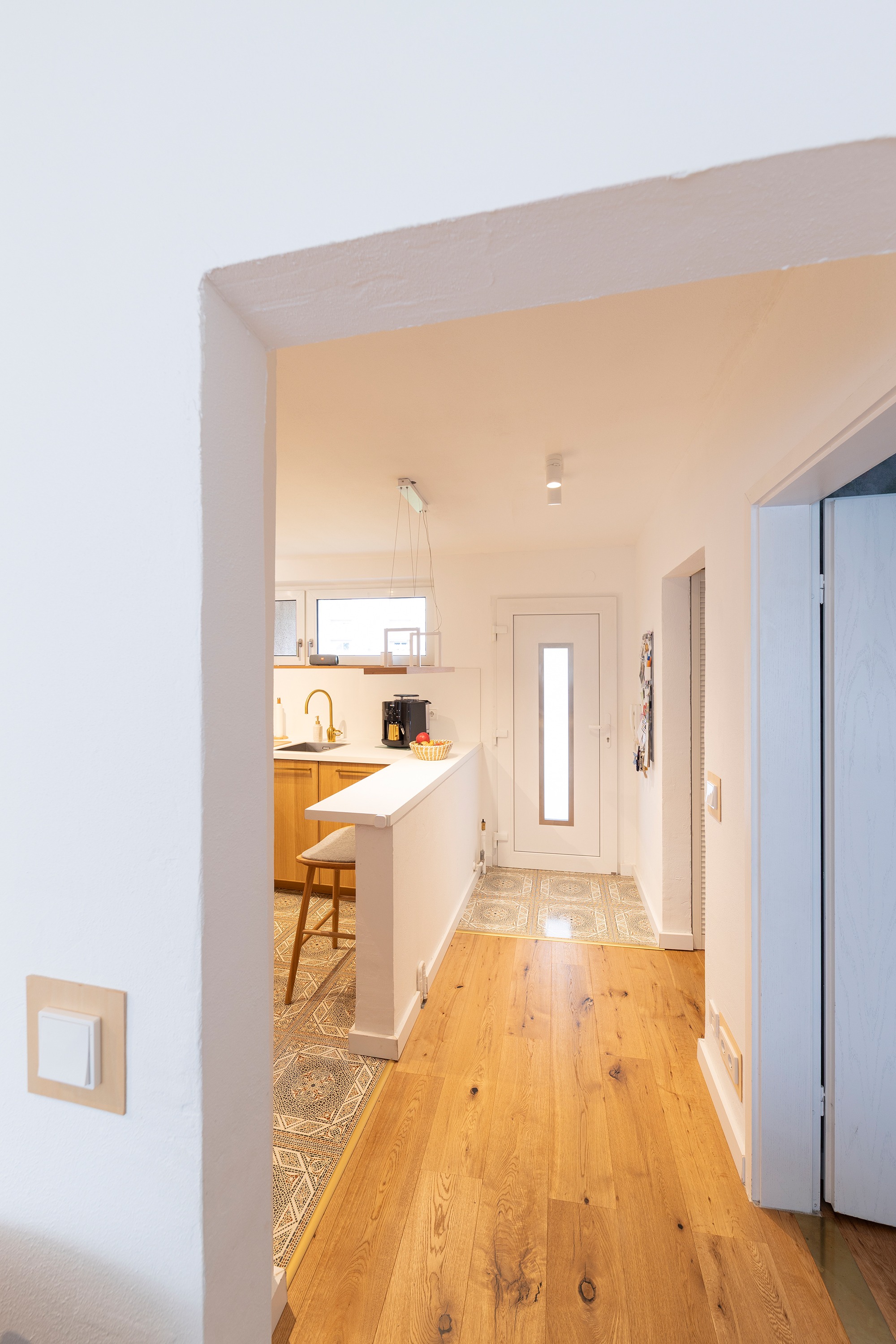 Über einen eigenen Laubengang, der nur zu dieser Einheit gehört, betritt man die schöne Wohnung und ist sofort im Entrée und Küchenbereich. Die Eingangssituation verleiht der Wohnung einen Haus in Haus Charakter.