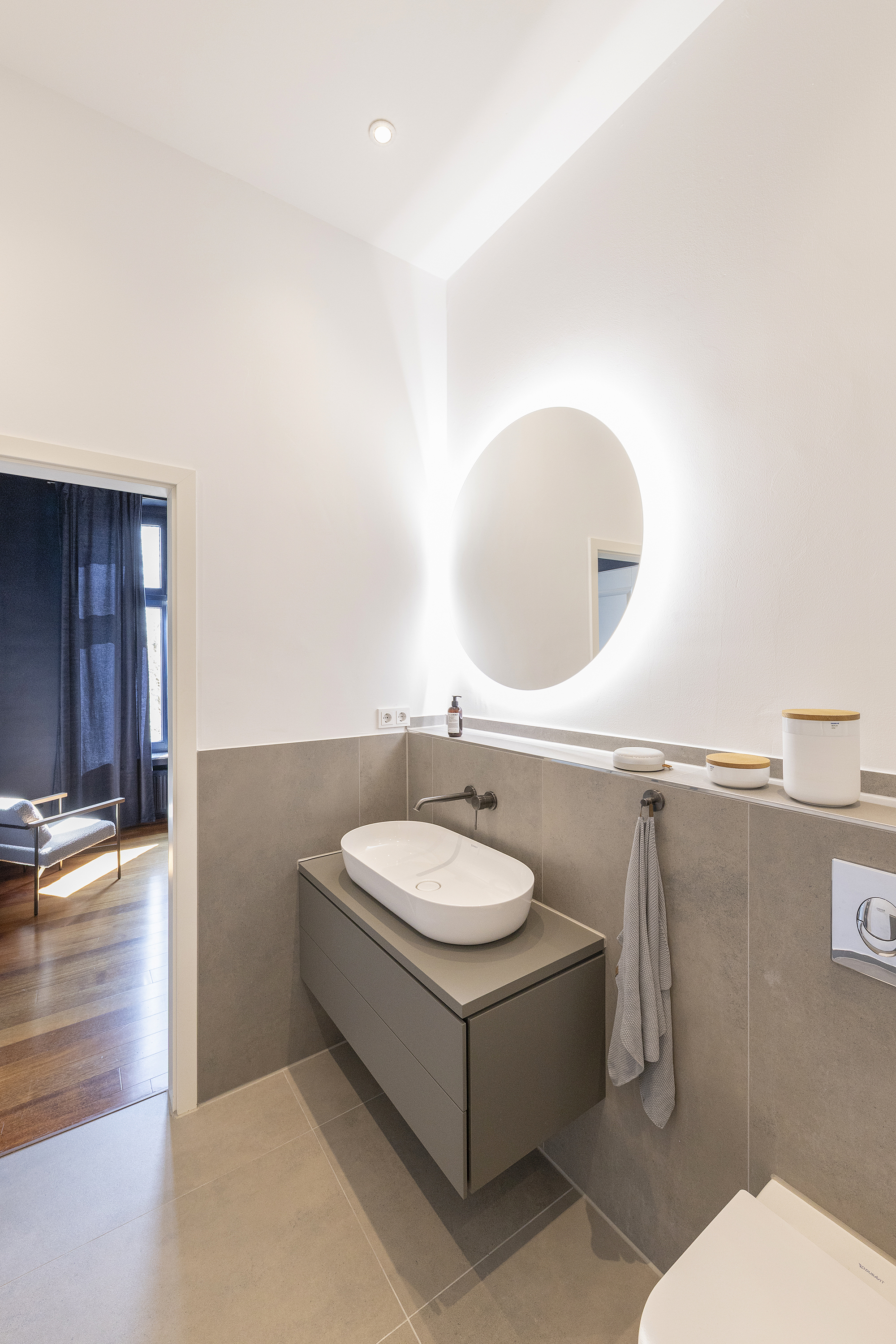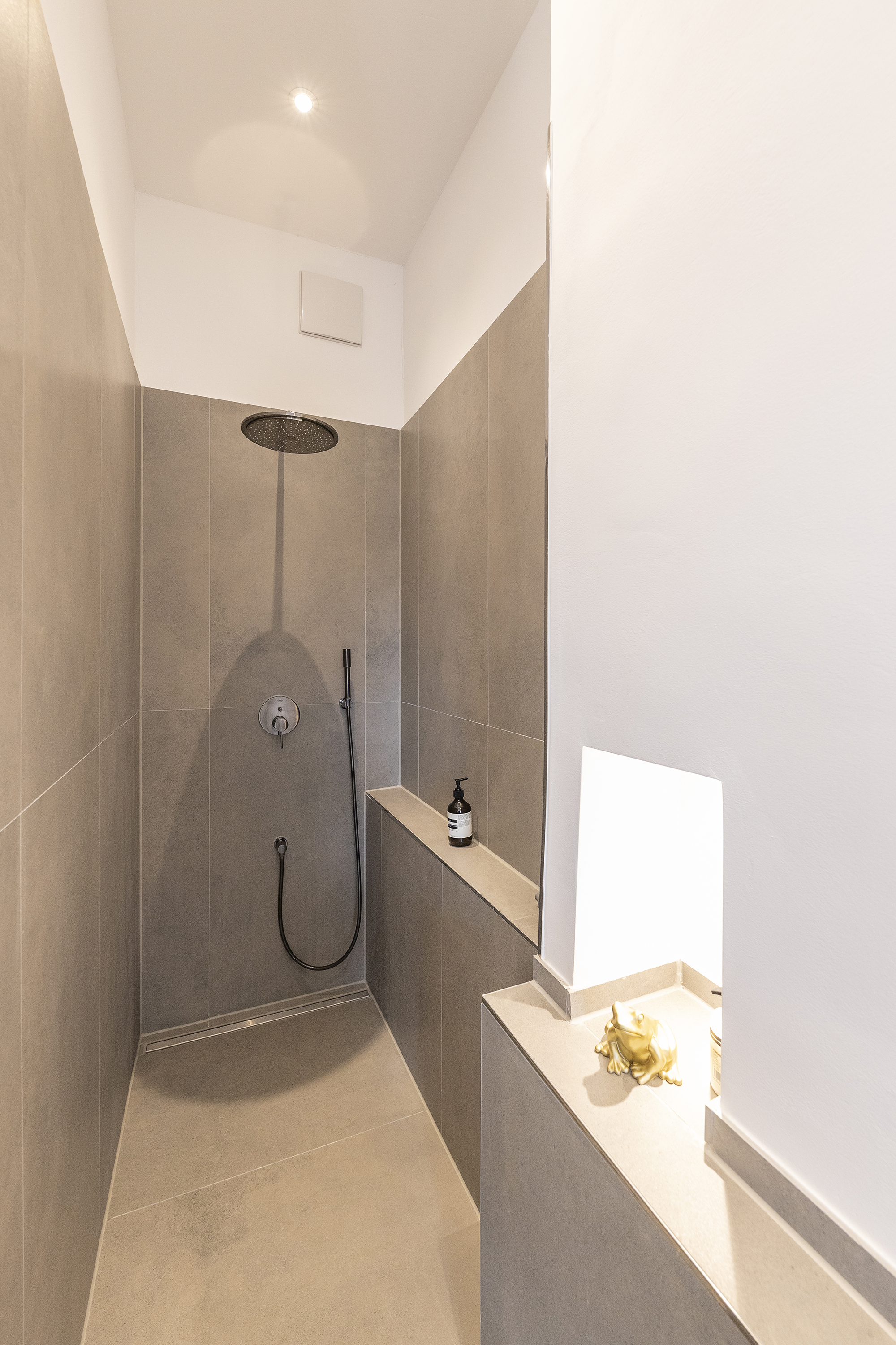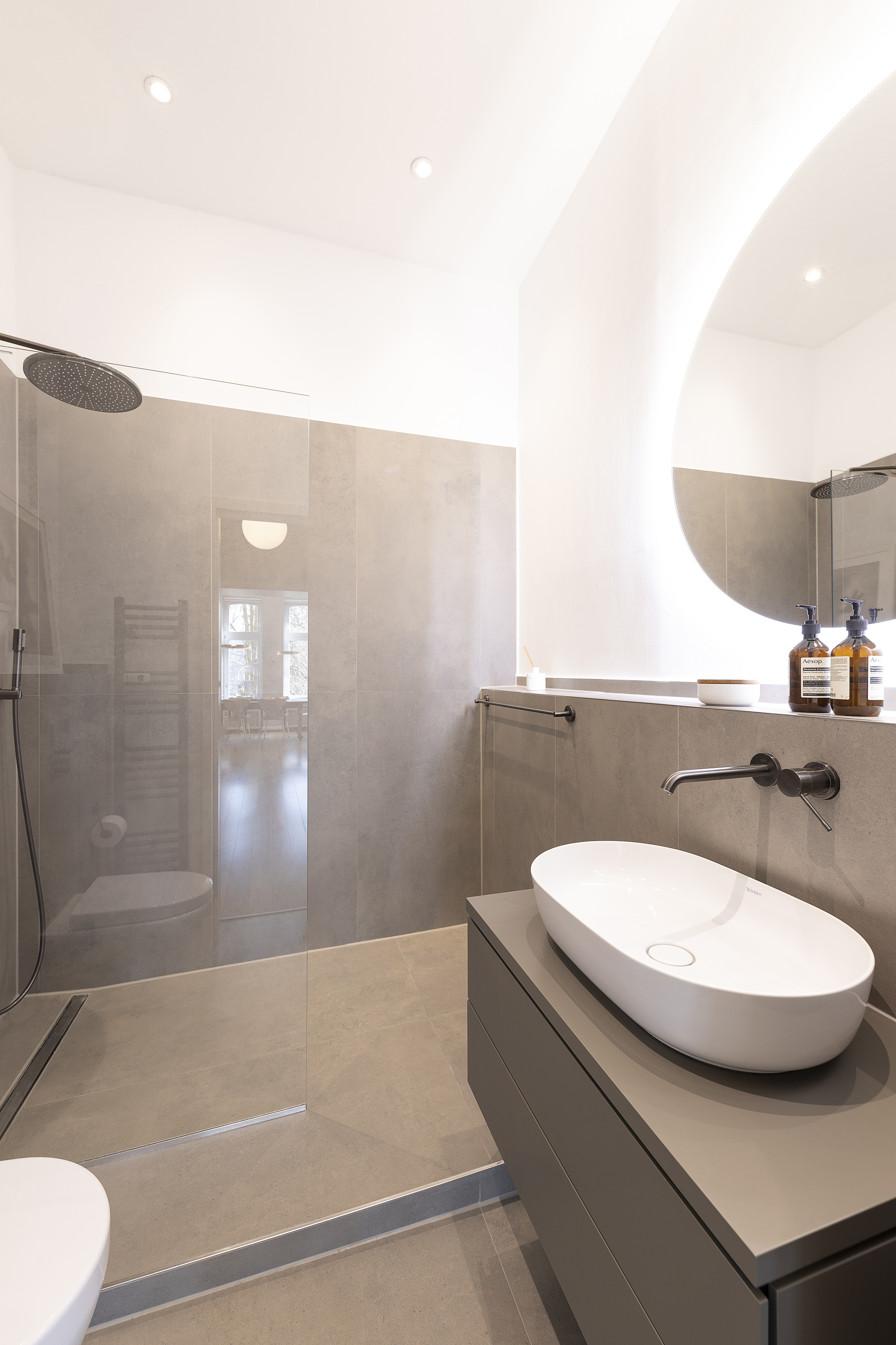 Beide Bäder wurden Ende 2021 hochwertig saniert und bestechen durch großformatige Feinsteinzeugfliesen, exklusive Duravit Waschbecken und WCs sowie Armaturen von Grohe.
