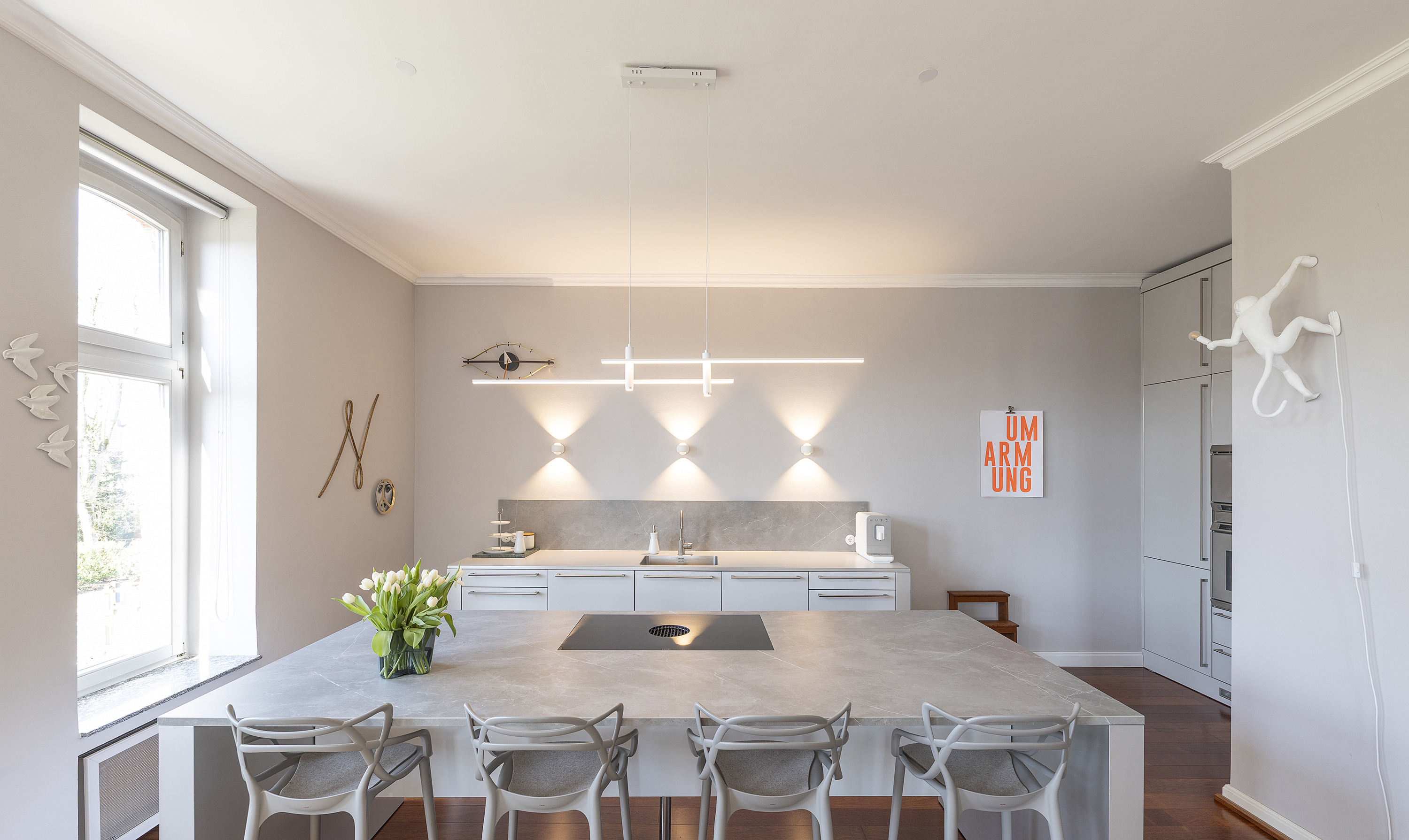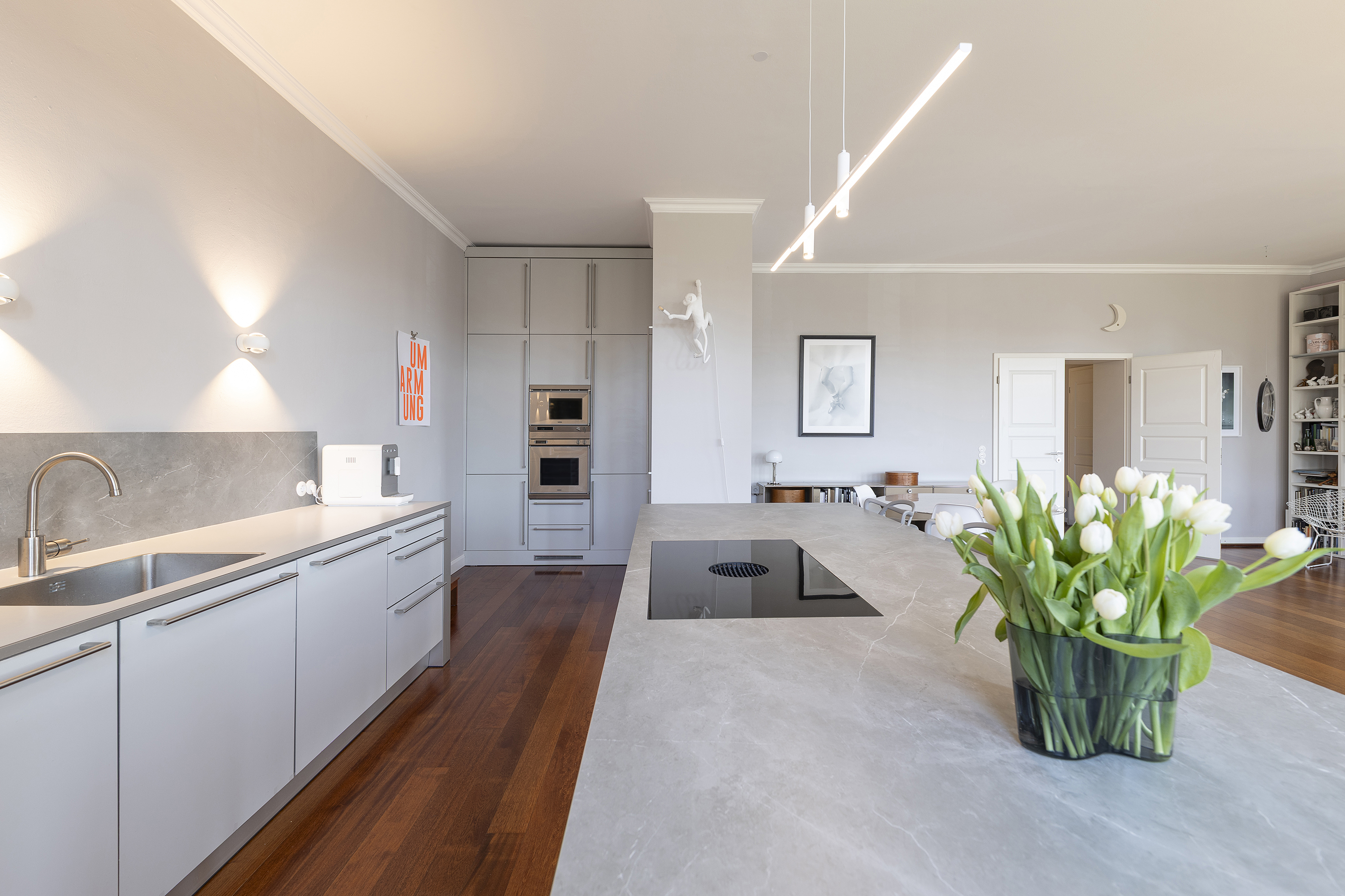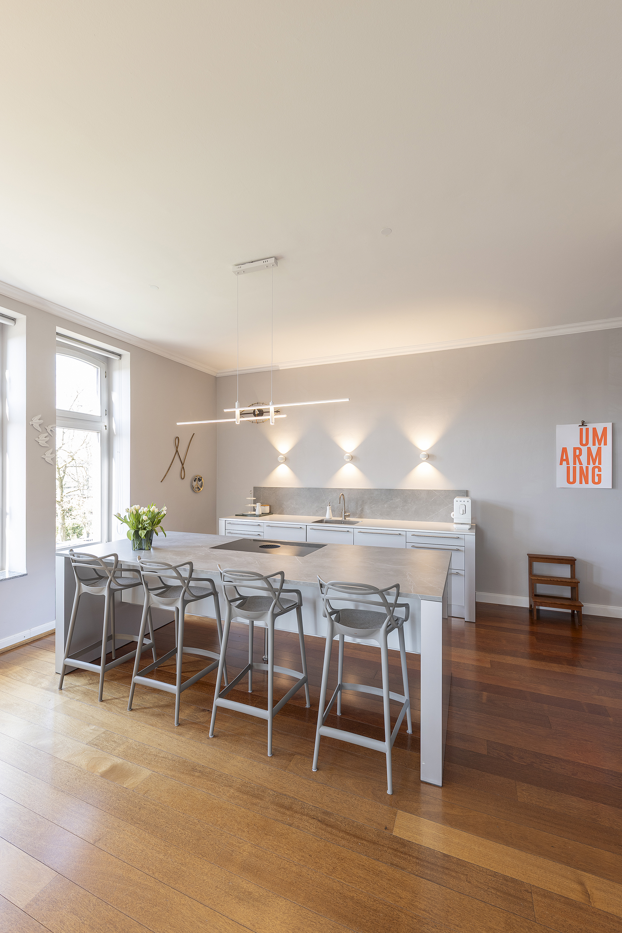 Betreten Sie Ihr neues Zuhause über das stilvolle Entrée und lassen Sie sich von der lichtdurchfluteten Atmosphäre des ca. 78 m² großen Wohn-Ess- und Kochbereichs verzaubern. Große tiefgezogene Fenster sorgen für ein helles und einladendes Ambiente.