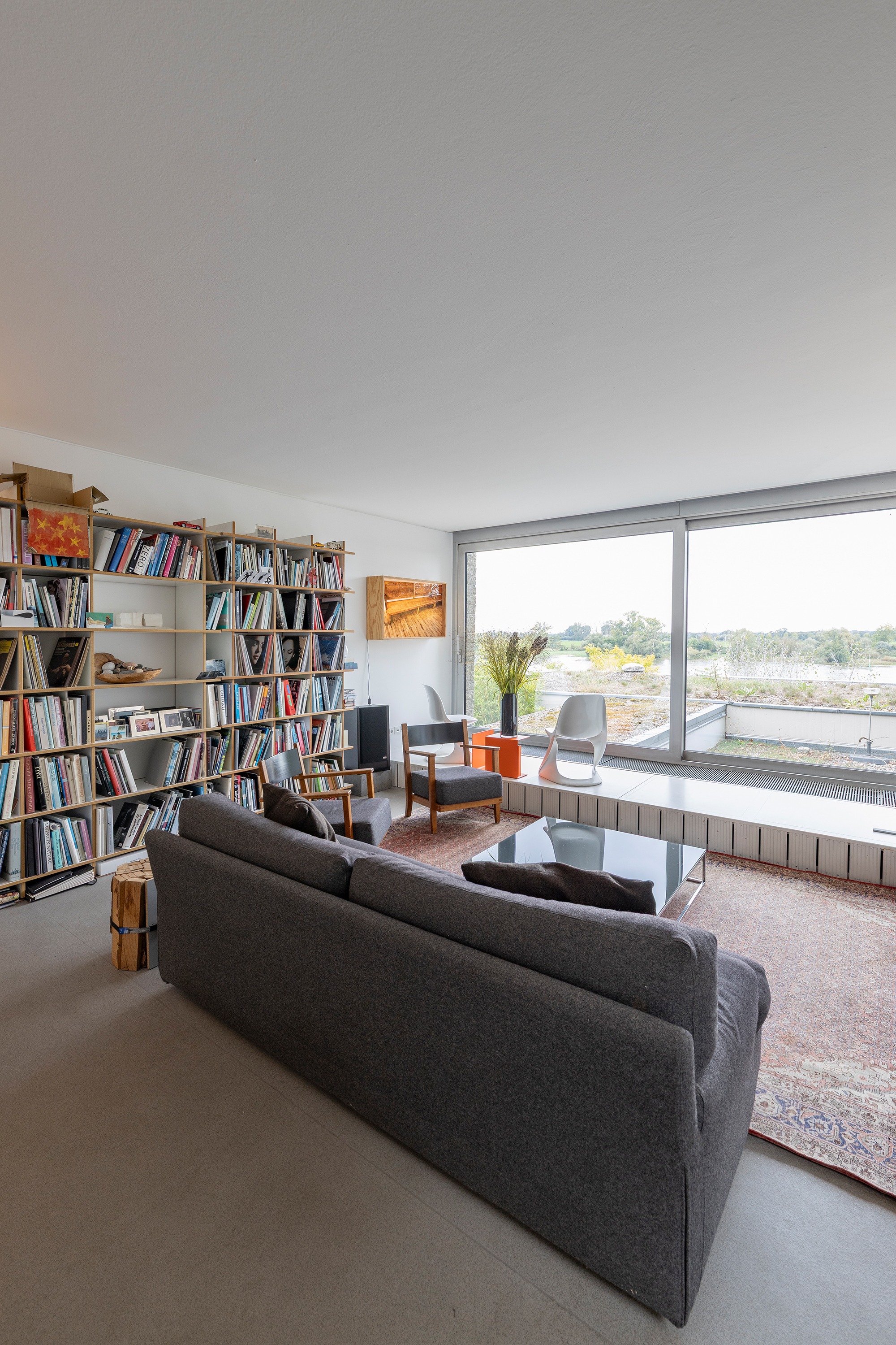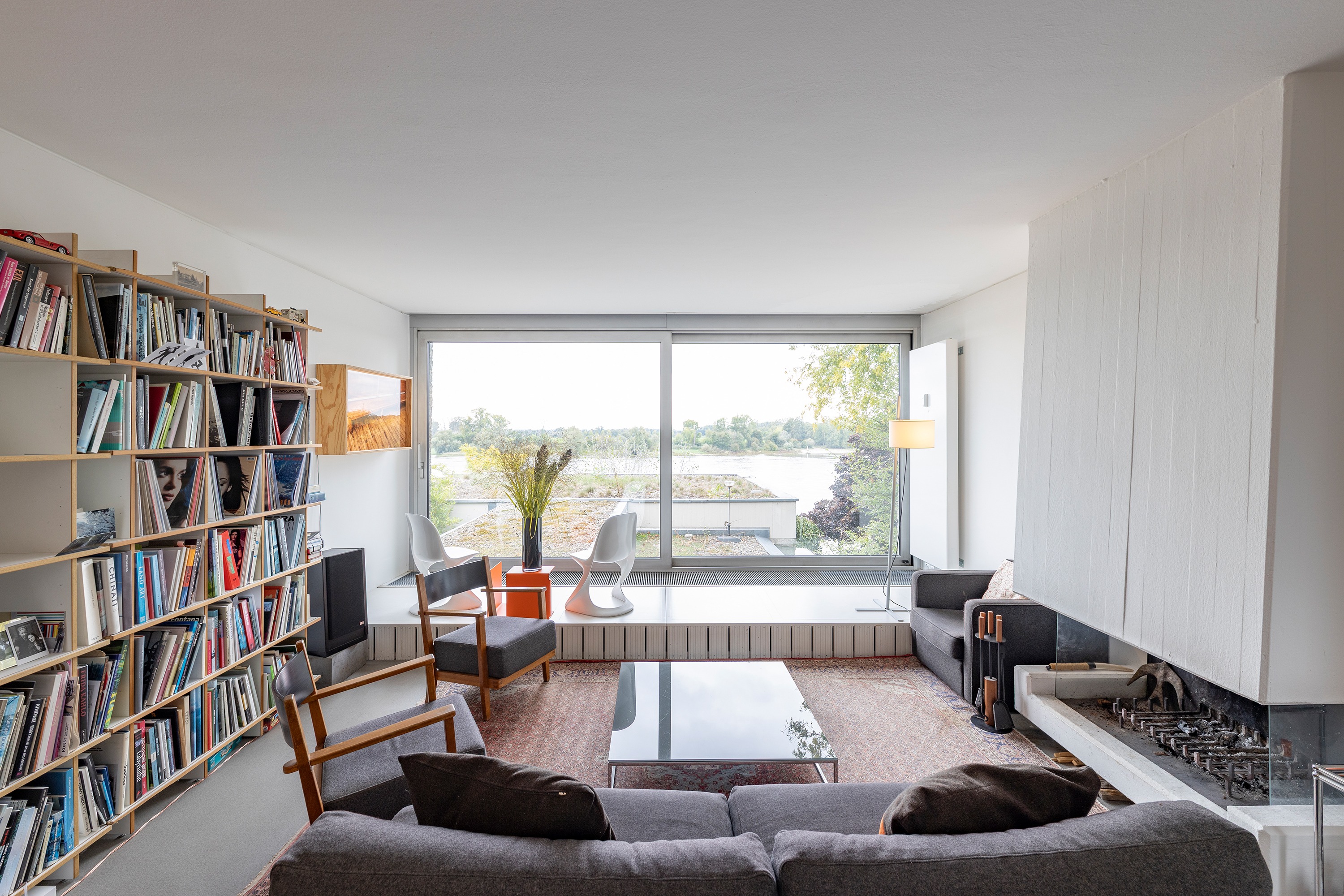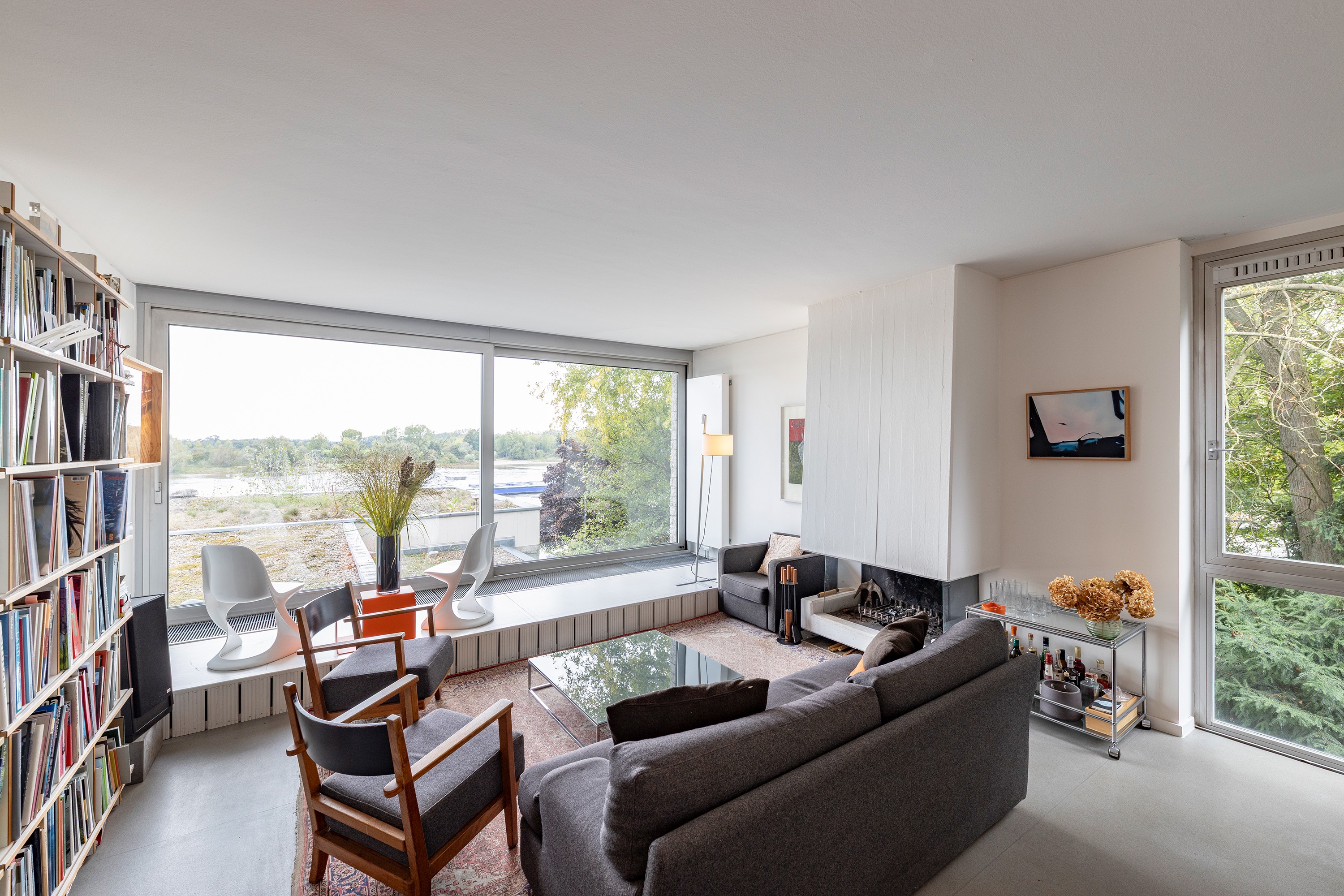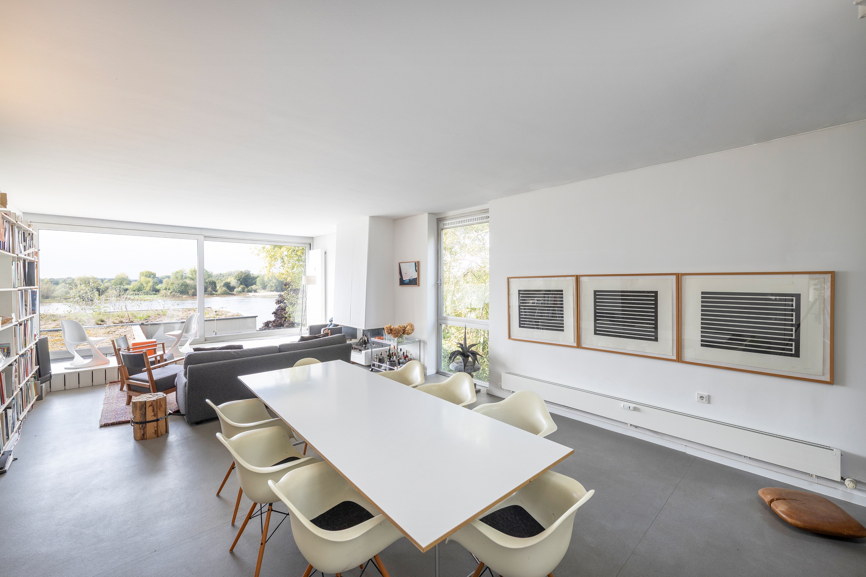 Die darüberliegende Wohnebene beeindruckt mit offener Raumgestaltung, stilvollem Kamin und einem Küchenblock mit angrenzendem Essbereich. Eine breite Fensterfront in Südwest-Ausrichtung bietet einen wundervollen Panoramablick auf den Rhein und taucht den Raum in natürliches Licht.