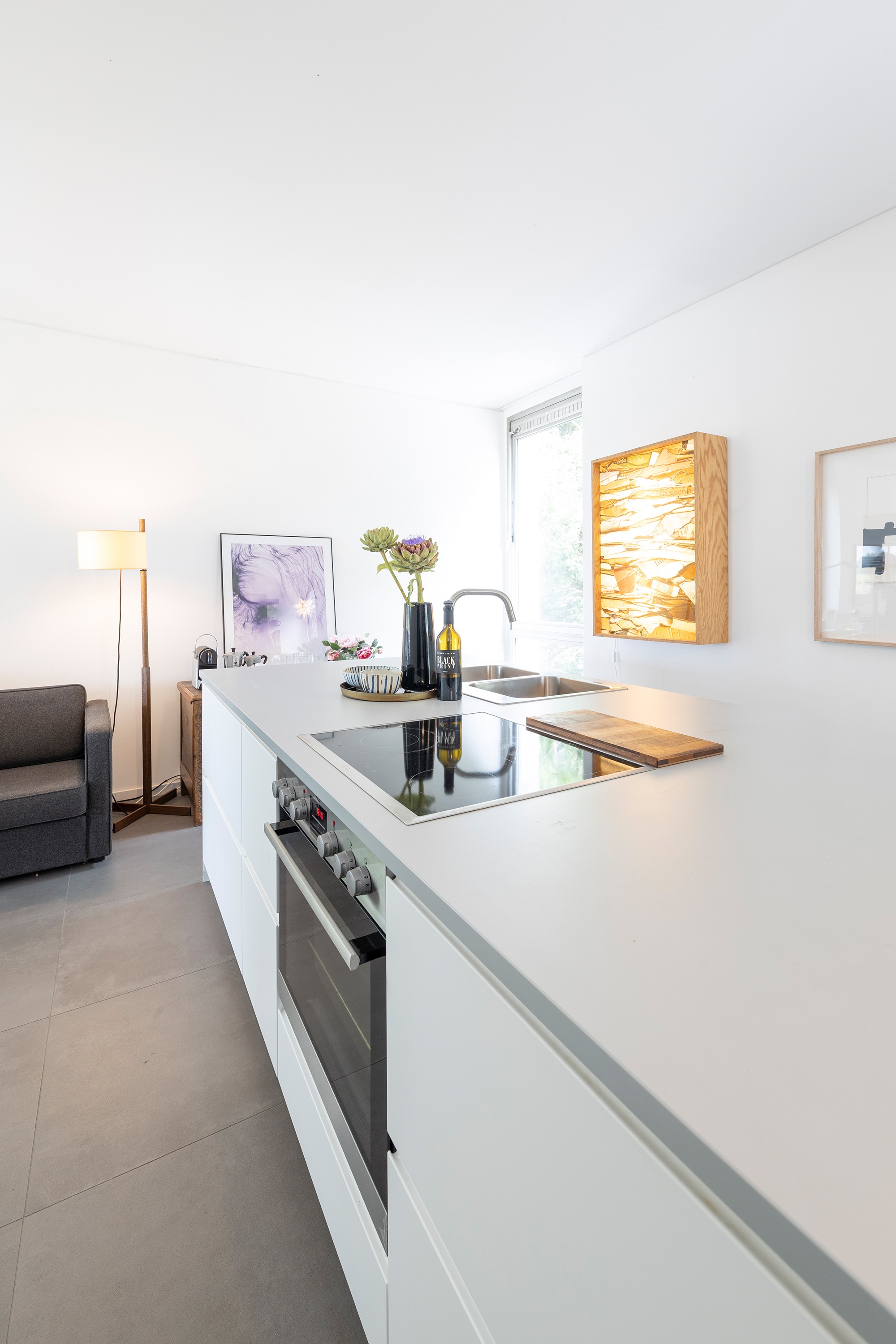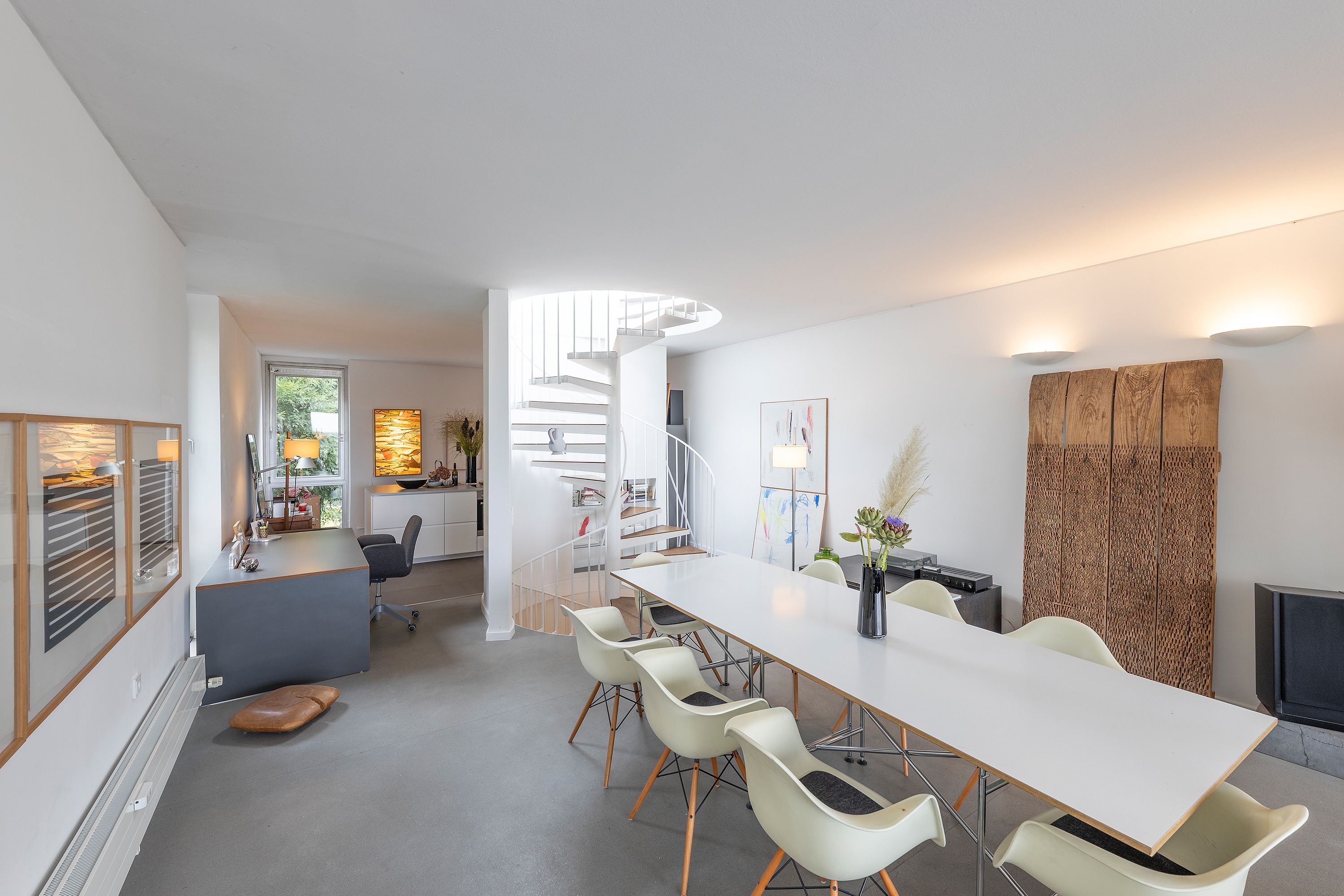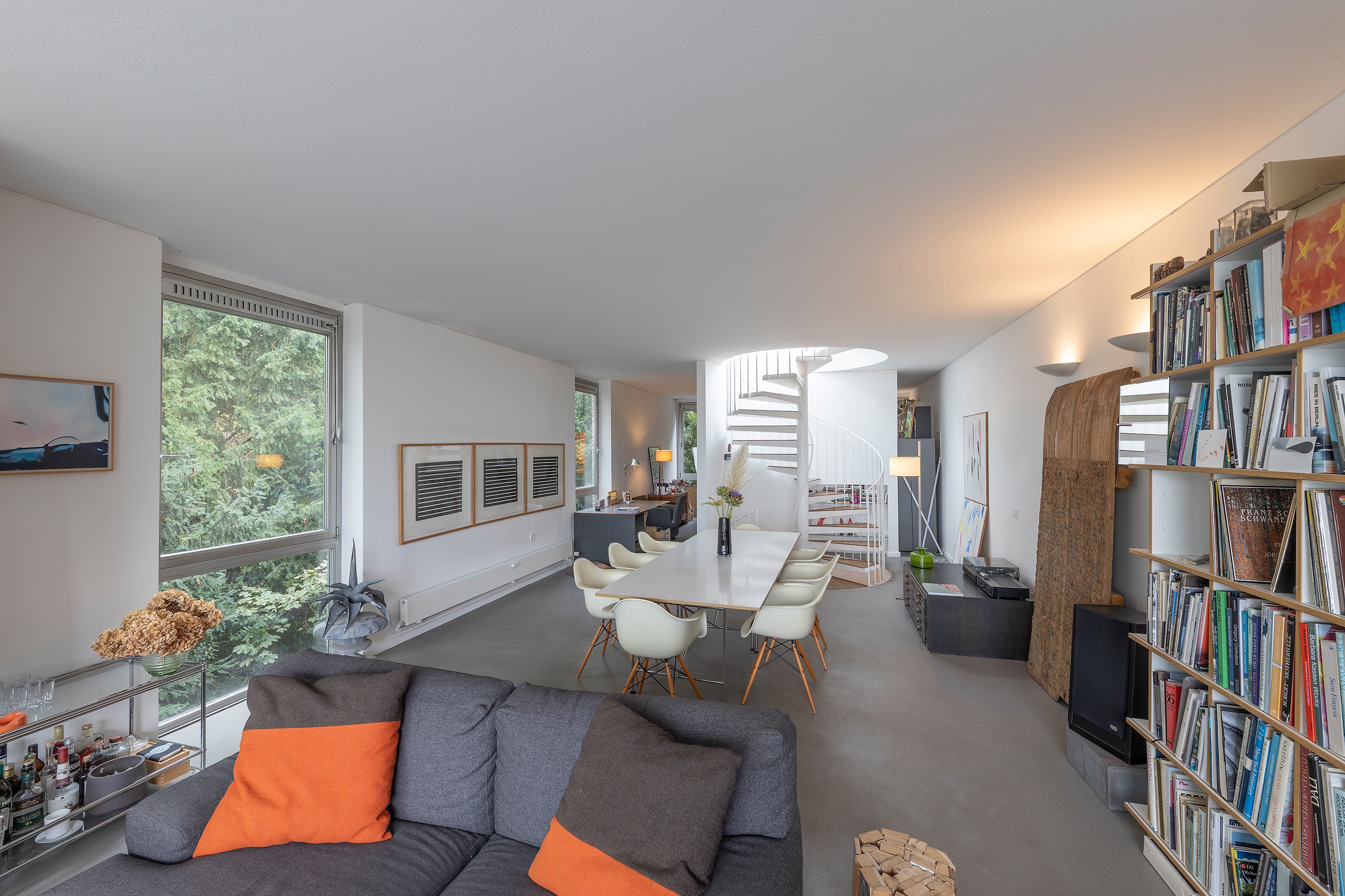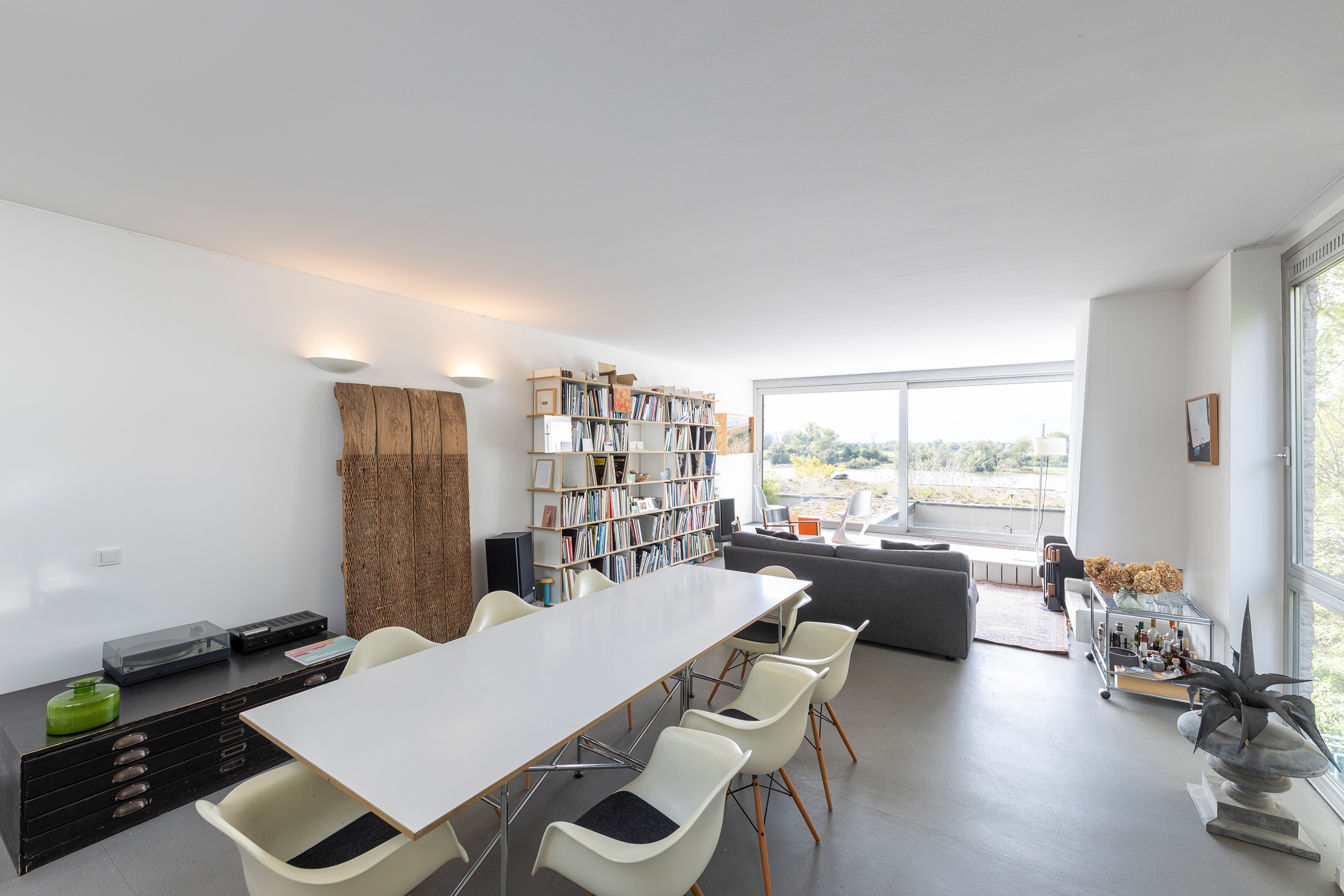 Die darüberliegende Wohnebene beeindruckt mit offener Raumgestaltung, stilvollem Kamin und einem Küchenblock mit angrenzendem Essbereich. Eine breite Fensterfront in Südwest-Ausrichtung bietet einen wundervollen Panoramablick auf den Rhein und taucht den Raum in natürliches Licht.