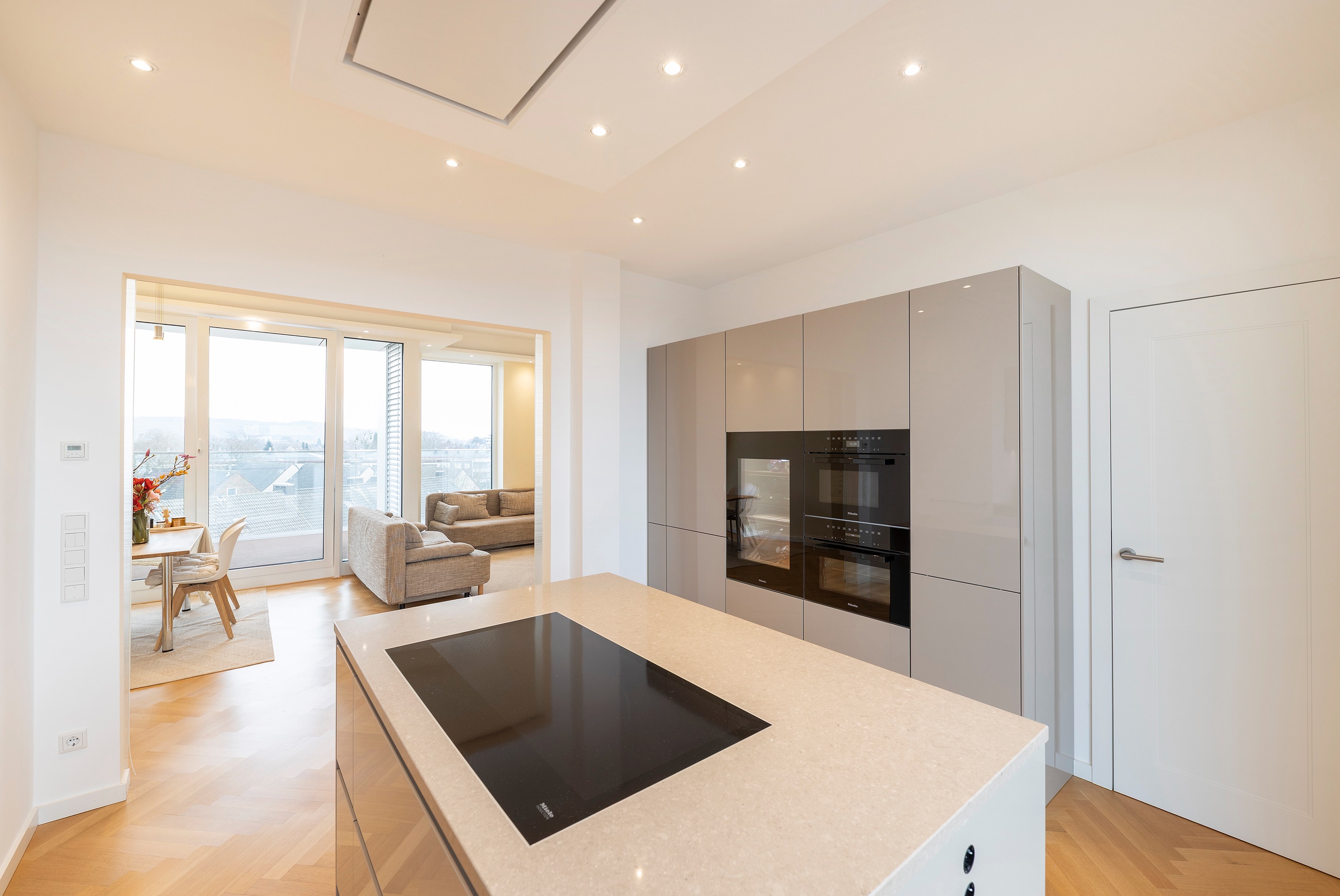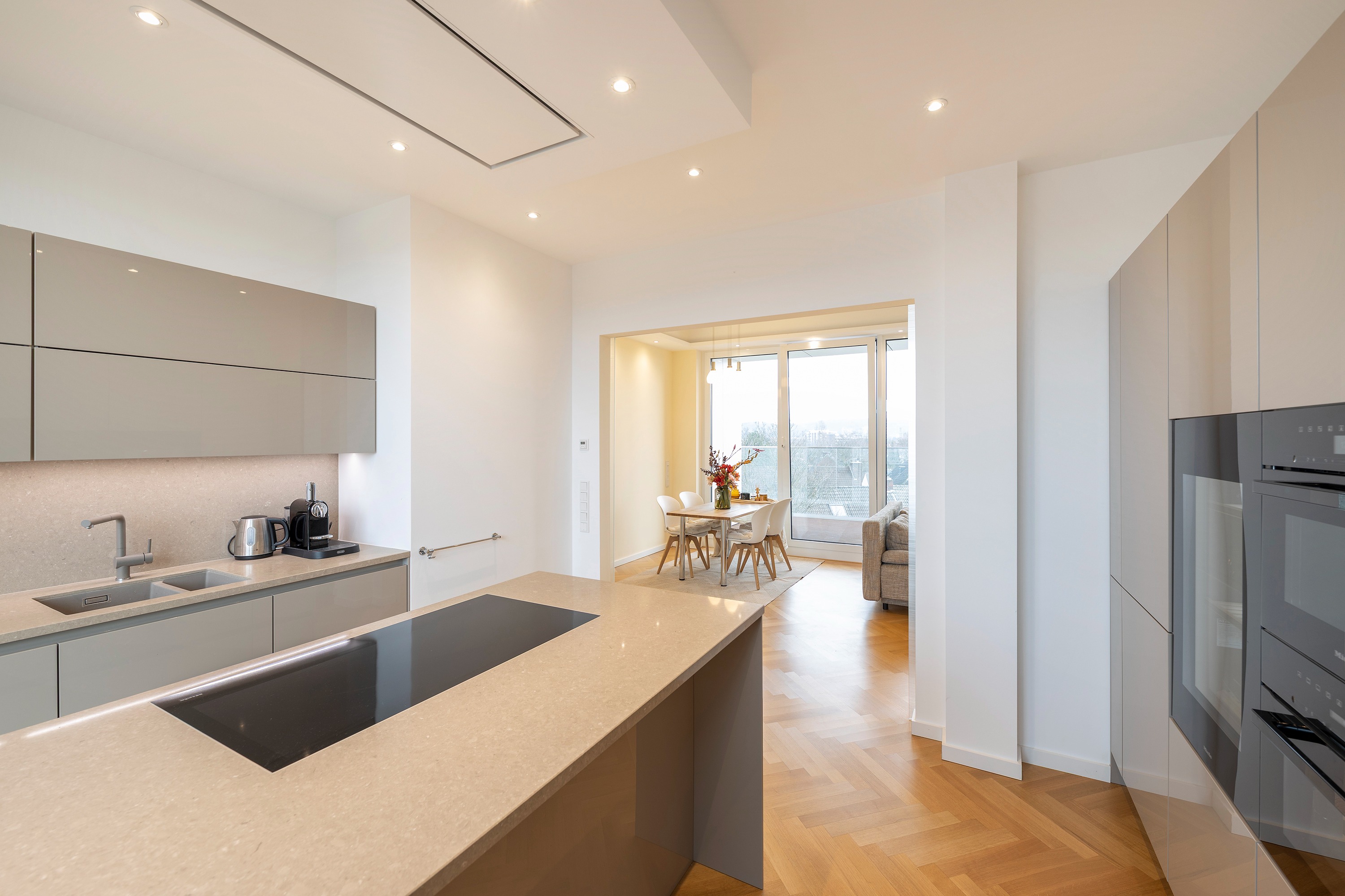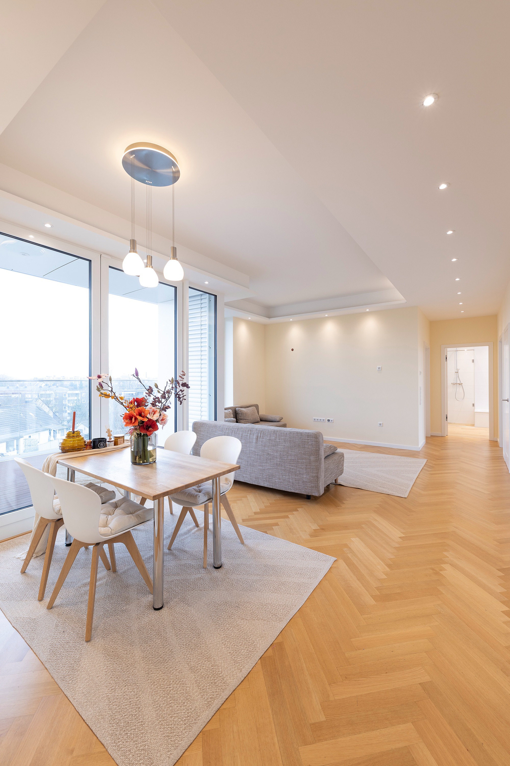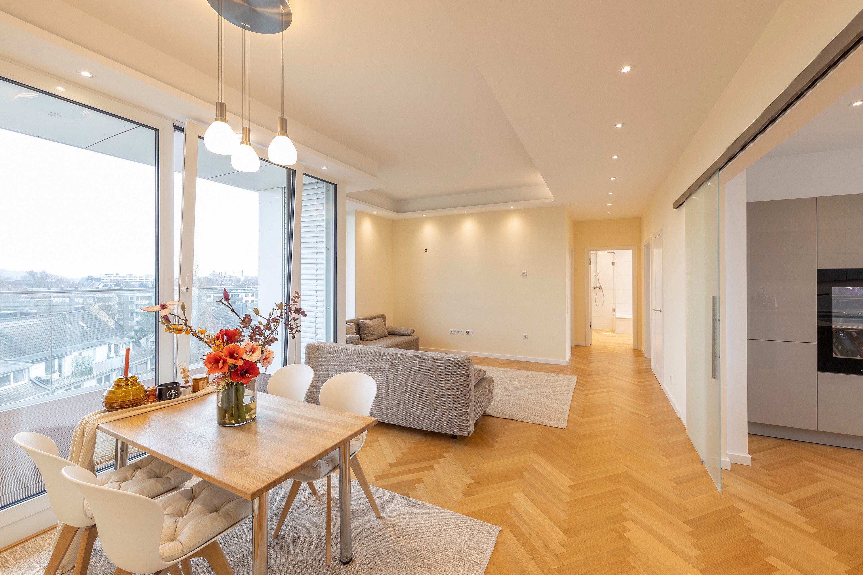 Schon beim Betreten der Wohnung eröffnet sich ein helles, offenes Wohnambiente. Das Entrée bietet einen direkten Blick in den eleganten Wohn- und Essbereich mit angrenzender exklusiver SieMatic-Einbauküche, die über zwei Glasschiebetüren mit dem Wohnraum verbunden ist. Maßgefertigte Einbauschränke im Eingangsbereich bieten reichlich Stauraum für Garderobe und Schuhe, das Gäste-WC liegt unmittelbar dahinter.