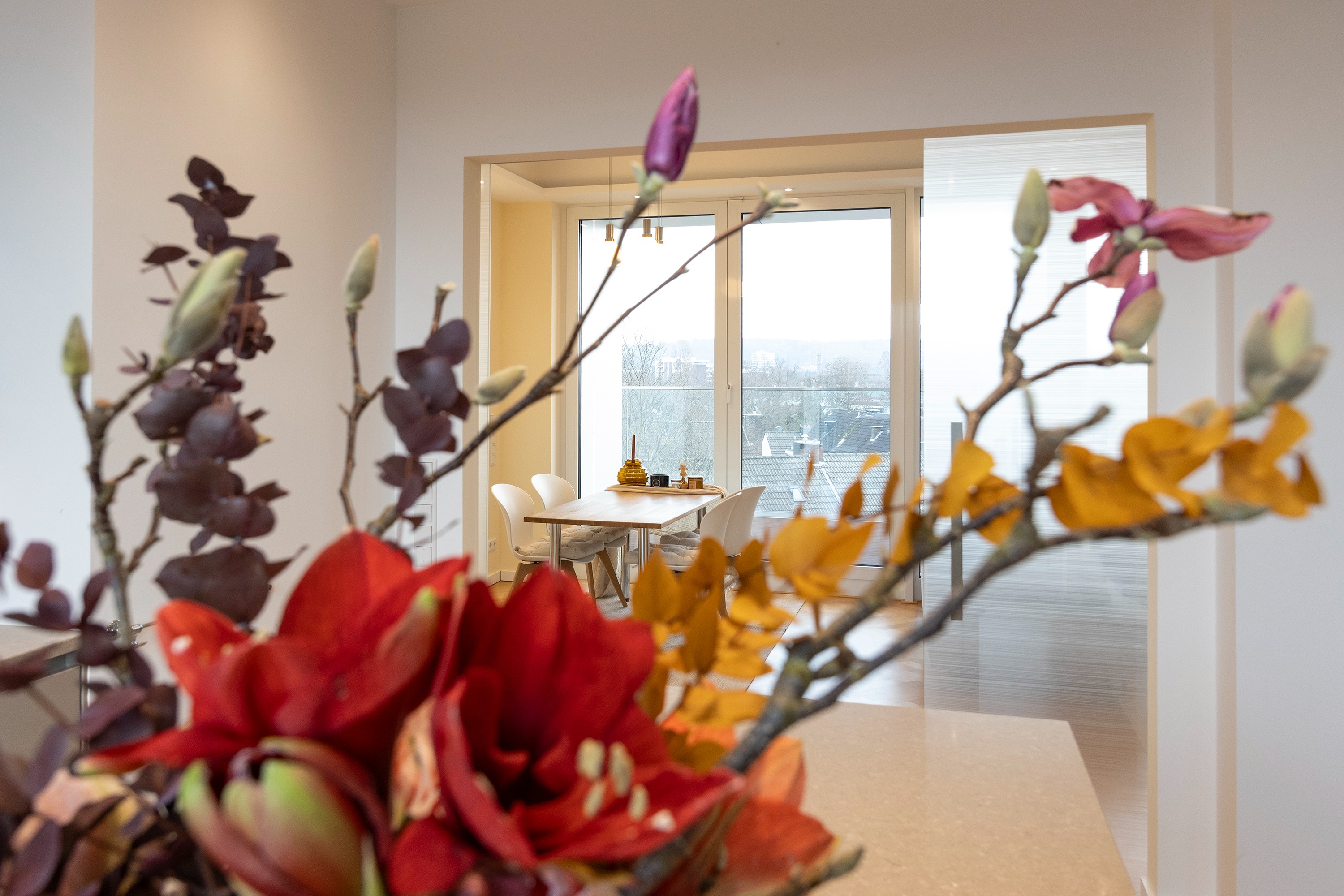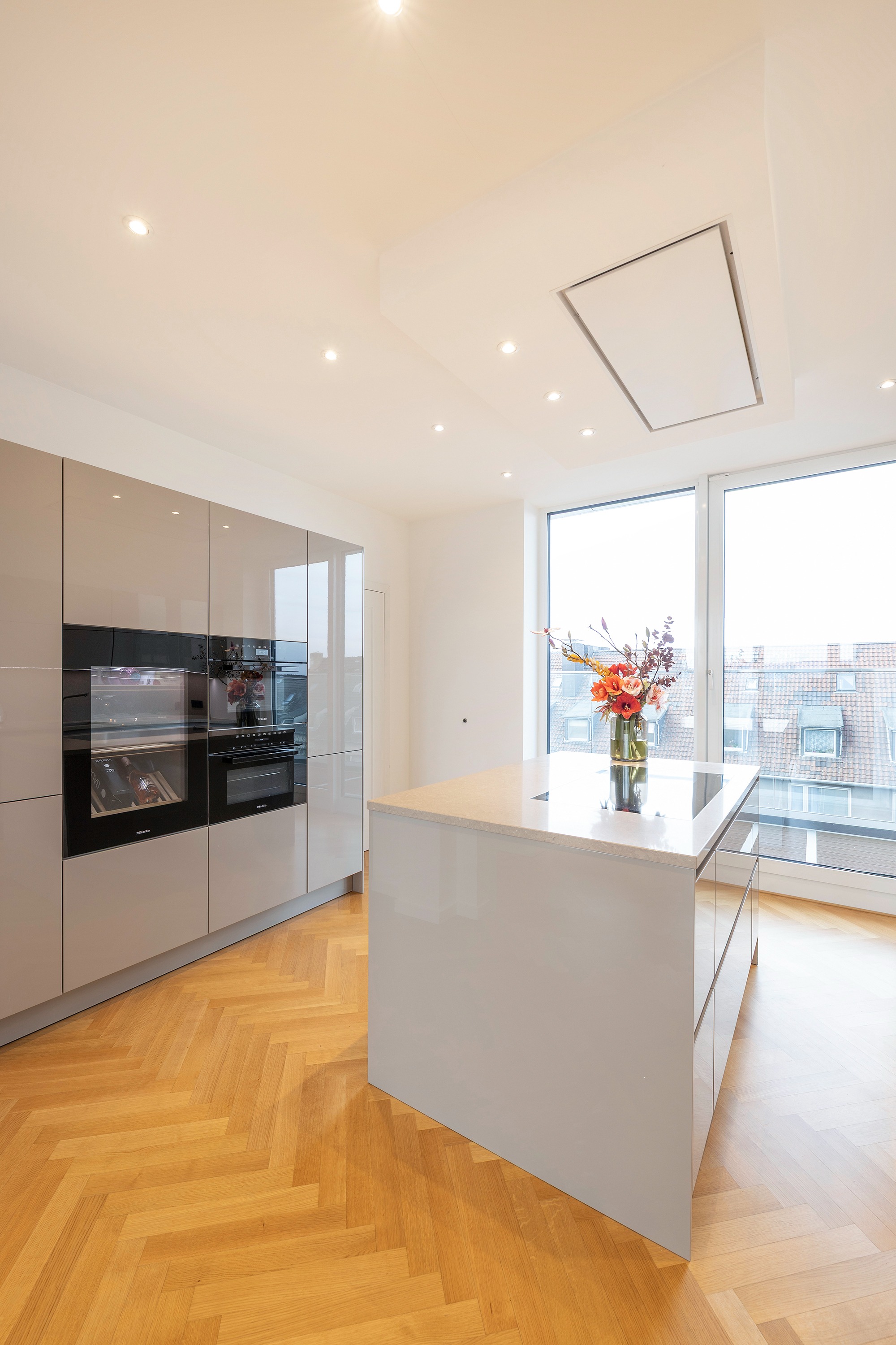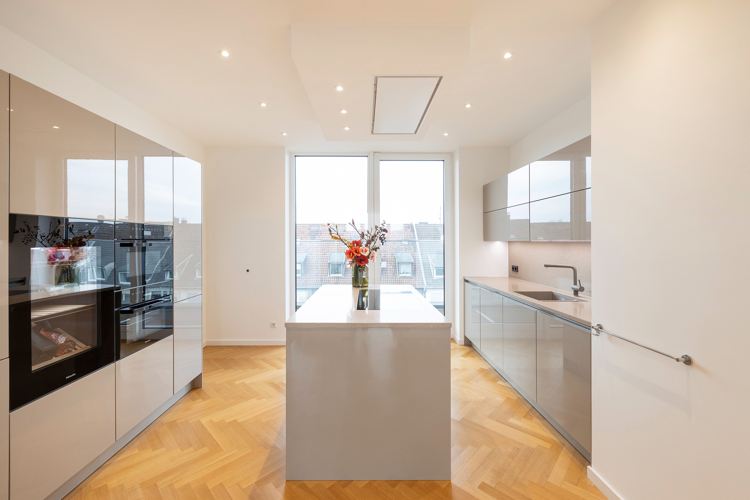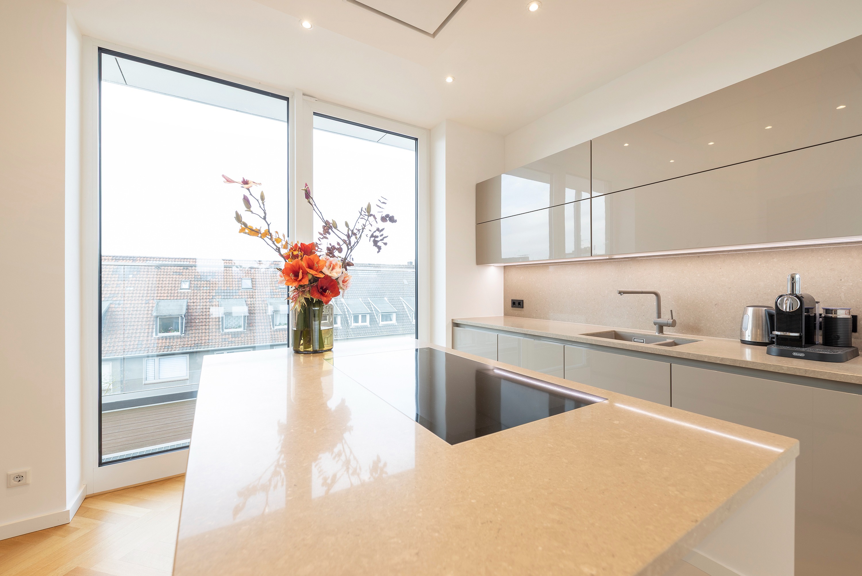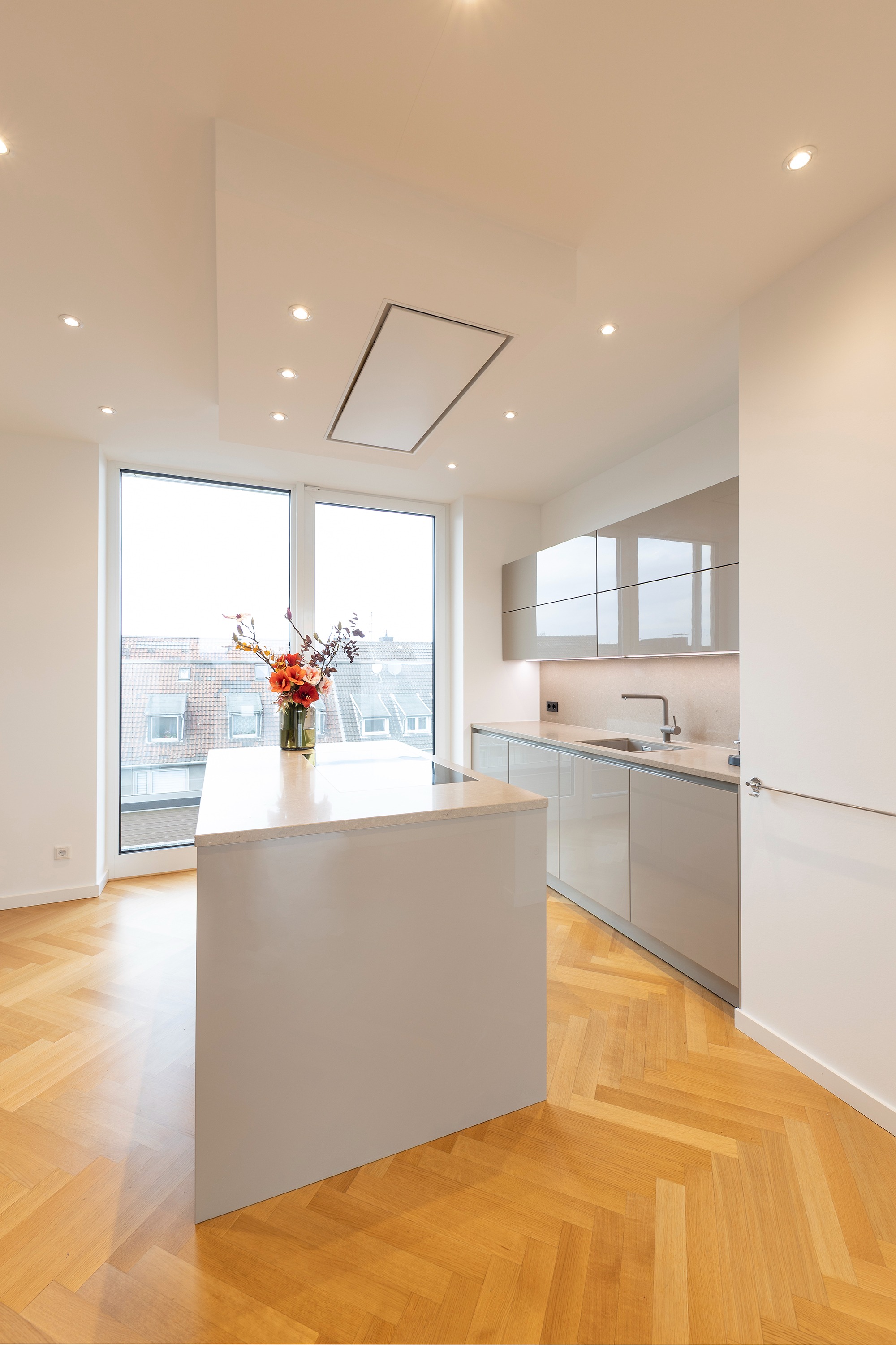 Schon beim Betreten der Wohnung eröffnet sich ein helles, offenes Wohnambiente. Das Entrée bietet einen direkten Blick in den eleganten Wohn- und Essbereich mit angrenzender exklusiver SieMatic-Einbauküche, die über zwei Glasschiebetüren mit dem Wohnraum verbunden ist. Maßgefertigte Einbauschränke im Eingangsbereich bieten reichlich Stauraum für Garderobe und Schuhe, das Gäste-WC liegt unmittelbar dahinter.