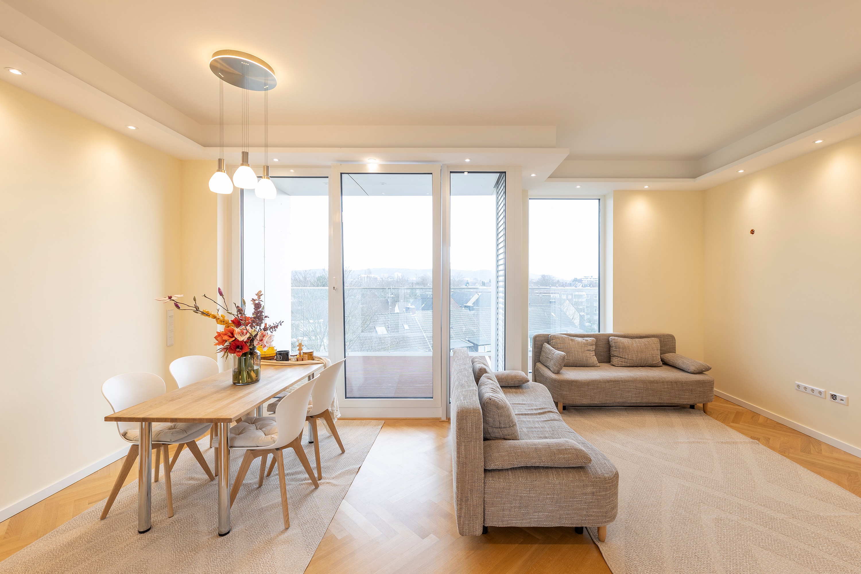 Ein absolutes Highlight dieser Wohnung sind die umlaufenden Außenflächen auf beiden Seiten: Bodentiefe Fenster ermöglichen von nahezu jedem Raum den direkten Zugang ins Freie und sorgen gleichzeitig für ein außergewöhnlich lichtdurchflutetes Wohngefühl.