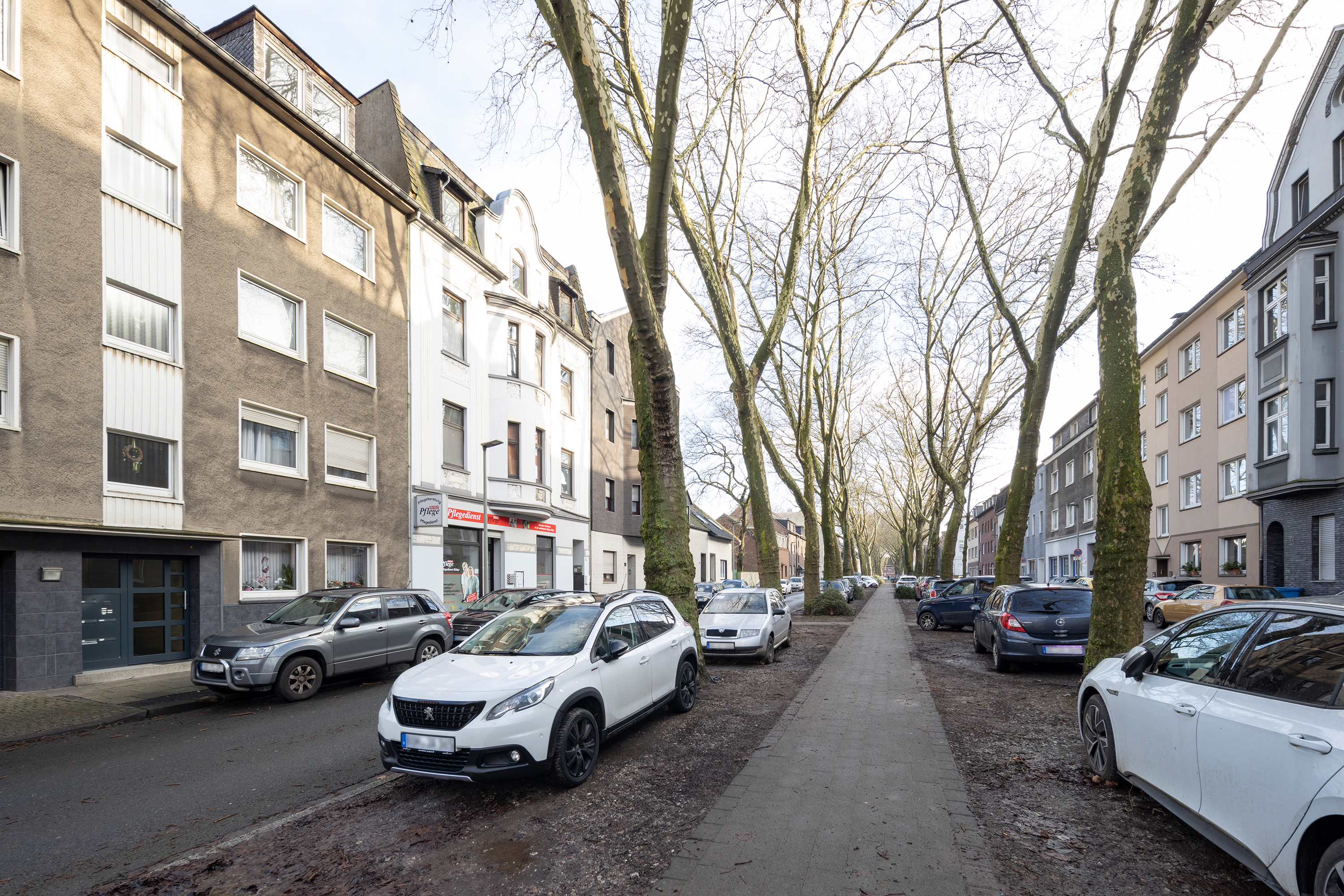 Das Haus liegt in einer 30er-Zone, die Straße ist durch eine Baumallee für Fußgänger geteilt.